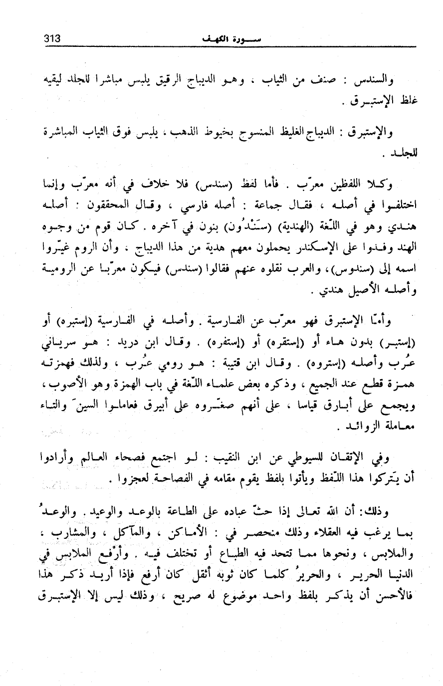 وَكِلَا اللَّفْظَيْنِ مُعَرَّبٌ. فَأَمَّا لَفْظُ (سُنْدُسٍ) فَلَا خِلَافَ فِي أَنَّهُ مُعَرَّبٌ وَإِنَّمَا اخْتَلَفُوا فِي أَصْلِهِ، فَقَالَ جَمَاعَةٌ: أَصْلُهُ فَارِسِيٌّ، وَقَالَ الْمُحَقِّقُونَ: أَصْلُهُ هِنْدِيٌّ وَهُوَ فِي اللُّغَةِ (الْهِنْدِيَّةِ) (سَنْدُونْ) بِنُونٍ فِي آخِرِهِ. كَانَ قَوْمٌ مِنْ وُجُوهِ الْهِنْدِ وَفَدُوا عَلَى الْإِسْكَنْدَر يحملون مَعَهم هَدِيَّةً مِنْ هَذَا الدِّيبَاجِ، وَأَنَّ الرُّومَ غَيَّرُوا اسْمَهُ إِلَى (سُنْدُوسْ) ، وَالْعَرَبُ نَقَلُوهُ عَنْهُمْ فَقَالُوا (سُنْدُسْ) فَيَكُونُ مُعَرَّبًا عَنِ الرُّومِيَّةِ وَأَصْلُهُ الْأَصِيلُ هِنْدِيٌّ.