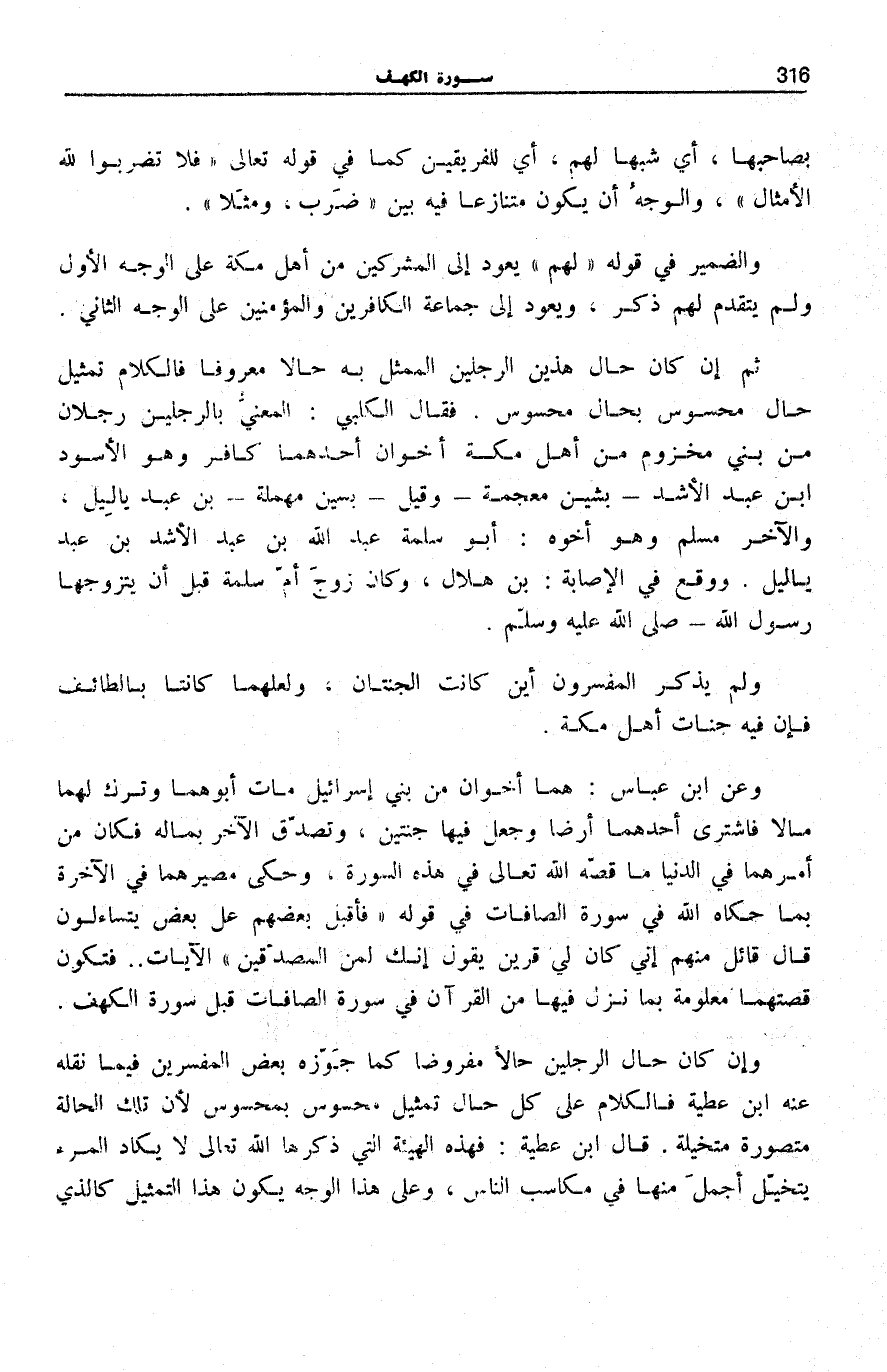 ثُمَّ إِنْ كَانَ حَالُ هَذَيْنِ الرَّجُلَيْنِ الْمُمَثَّلُ بِهِ حَالًا مَعْرُوفًا فَالْكَلَامُ تَمْثِيلُ حَالٍ مَحْسُوسٍ بِحَالٍ مَحْسُوسٍ. فَقَالَ الْكَلْبِيُّ: الْمَعْنِيُّ بِالرَّجُلَيْنِ رَجُلَانِ مِنْ بَنِي مَخْزُومٍ مِنْ أَهْلِ مَكَّةَ أَخَوَانِ أَحَدُهُمَا كَافِرٌ وَهُوَ الْأَسْوَدُ بْنُ عَبْدِ الْأَشَدِّ- بِشِينٍ مُعْجَمَةٍ- وَقِيلَ- بِسِينٍ مُهْمَلَةٍ- بن عَبْدِ يَالِيلَ، وَالْآخَرُ مُسْلِمٌ وَهُوَ أَخُوهُ: أَبُو سَلَمَةَ عَبْدُ اللَّهِ بْنُ عَبْدِ الْأَشَدِّ بْنِ عَبْدِ يَالِيلَ.