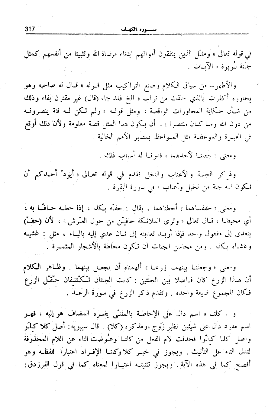 وَيَجُوزُ فِي خَبَرِ كِلَا وَكِلْتَا الْإِفْرَادُ اعْتِبَارًا لِلَفْظِهِ وَهُوَ أَفْصَحُ كَمَا فِي هَذِهِ الْآيَةِ. وَيَجُوزُ تَثْنِيَتُهُ اعْتِبَارًا لِمَعْنَاهُ كَمَا فِي قَوْلِ الْفَرَزْدَقِ: