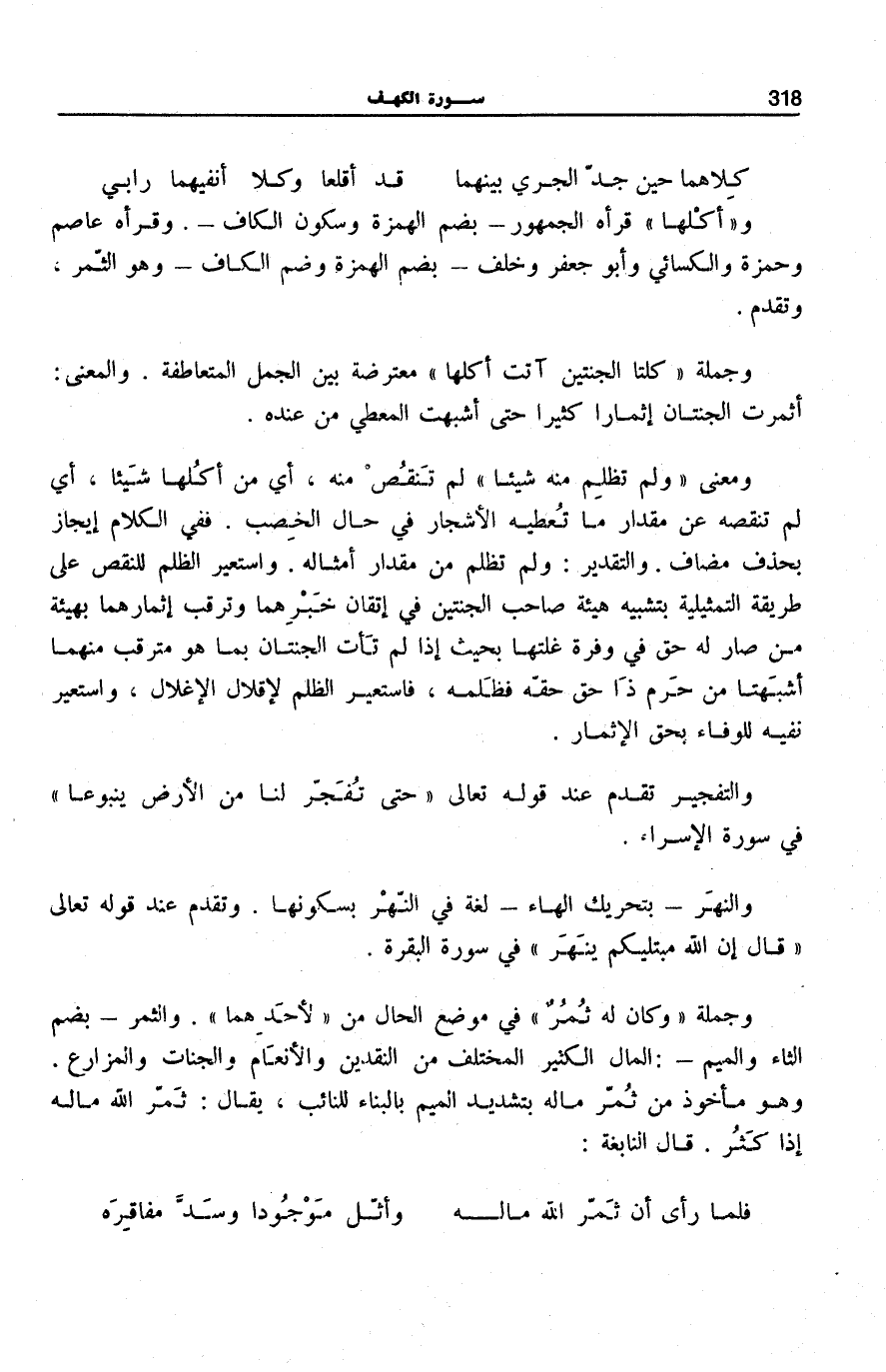 وَمَعْنَى وَلَمْ تَظْلِمْ مِنْهُ شَيْئاً لَمْ تَنْقُصْ مِنْهُ، أَيْ مِنْ أُكُلِهَا شَيْئًا، أَيْ لَمْ تَنْقُصْهُ عَنْ مِقْدَارِ مَا تُعْطِيهِ الْأَشْجَارُ فِي حَالِ الْخِصْبِ. فَفِي الْكَلَامِ إِيجَازٌ بِحَذْفِ مُضَافٍ. وَالتَّقْدِيرُ: