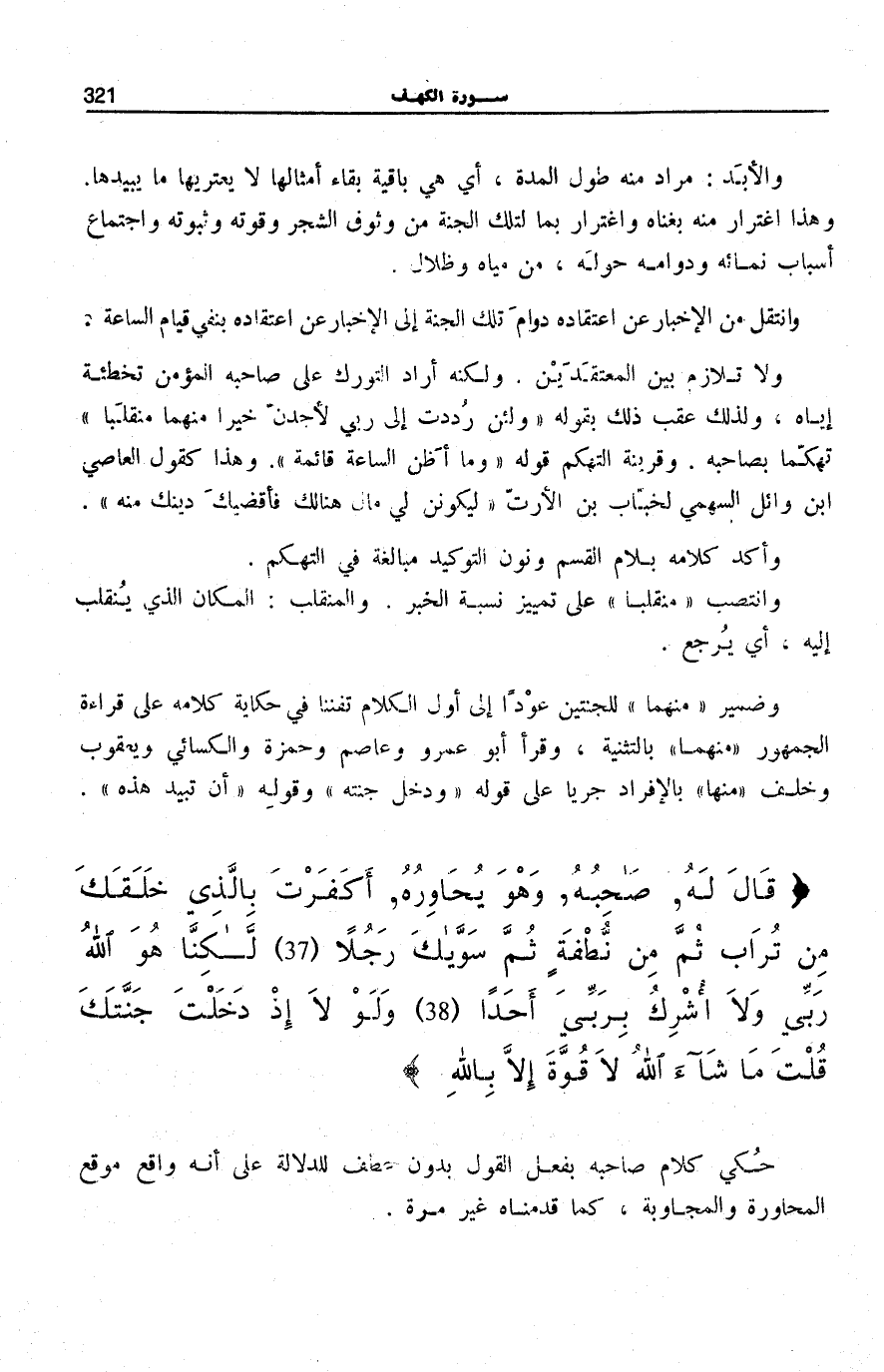 قالَ لَهُ صاحِبُهُ وَهُوَ يُحاوِرُهُ أَكَفَرْتَ بِالَّذِي خَلَقَكَ مِنْ تُرابٍ ثُمَّ مِنْ نُطْفَةٍ ثُمَّ سَوَّاكَ رَجُلاً (37) لكِنَّا هُوَ اللَّهُ رَبِّي وَلا أُشْرِكُ بِرَبِّي أَحَداً (38) وَلَوْلا إِذْ دَخَلْتَ جَنَّتَكَ قُلْتَ مَا شاءَ اللَّهُ لَا قُوَّةَ إِلاَّ بِاللَّهِ إِنْ تَرَنِ أَنَا أَقَلَّ مِنْكَ مَالا وَوَلَداً (39) فَعَسى رَبِّي أَنْ يُؤْتِيَنِ خَيْراً مِنْ جَنَّتِكَ وَيُرْسِلَ عَلَيْها حُسْباناً مِنَ السَّماءِ فَتُصْبِحَ صَعِيداً زَلَقاً (40) أَوْ يُصْبِحَ ماؤُها غَوْراً فَلَنْ تَسْتَطِيعَ لَهُ طَلَباً (41)