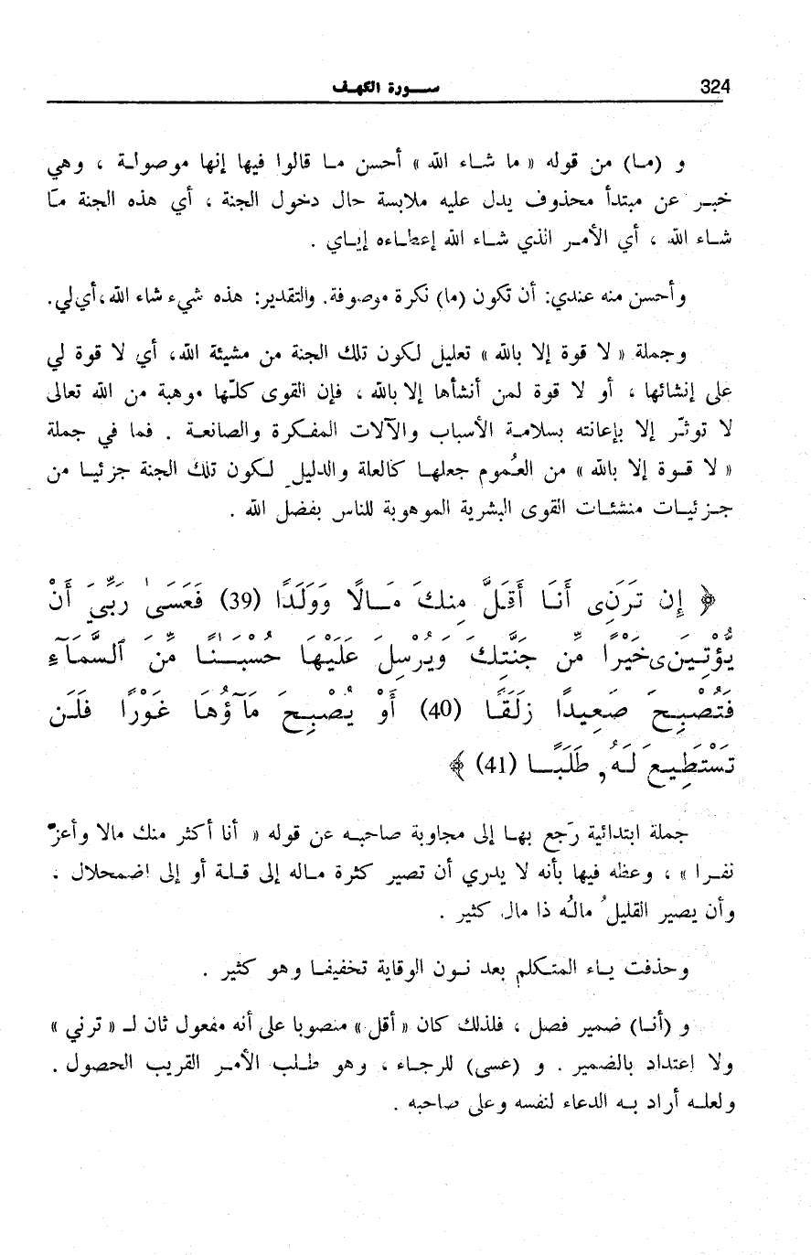 وَجُمْلَةُ لَا قُوَّةَ إِلَّا بِاللَّهِ تَعْلِيلٌ لِكَوْنِ تِلْكَ الْجَنَّةِ مِنْ مَشِيئَةِ اللَّهِ، أَيْ لَا قُوَّةَ لِي عَلَى إِنْشَائِهَا، أَوْ لَا قُوَّةَ لِمَنْ أَنْشَأَهَا إِلَّا بِاللَّهِ، فَإِنَّ الْقُوَى كُلَّهَا مَوْهِبَةٌ مِنَ اللَّهِ تَعَالَى لَا تُؤَثِّرُ إِلَّا بِإِعَانَتِهِ بِسَلَامَةِ الْأَسْبَابِ وَالْآلَاتِ الْمُفَكِّرَةِ وَالصَّانِعَةِ. فَمَا فِي جُمْلَةِ لَا قُوَّةَ إِلَّا بِاللَّهِ مِنَ الْعُمُومِ جَعَلَهَا كَالْعِلَّةِ وَالدَّلِيلِ لِكَوْنِ تِلْكَ الْجَنَّةِ جُزْئِيًّا من جزئيات منشئات الْقُوَى الْبَشَرِيَّةِ الْمَوْهُوبَةِ لِلنَّاسِ بِفَضْلِ الله.