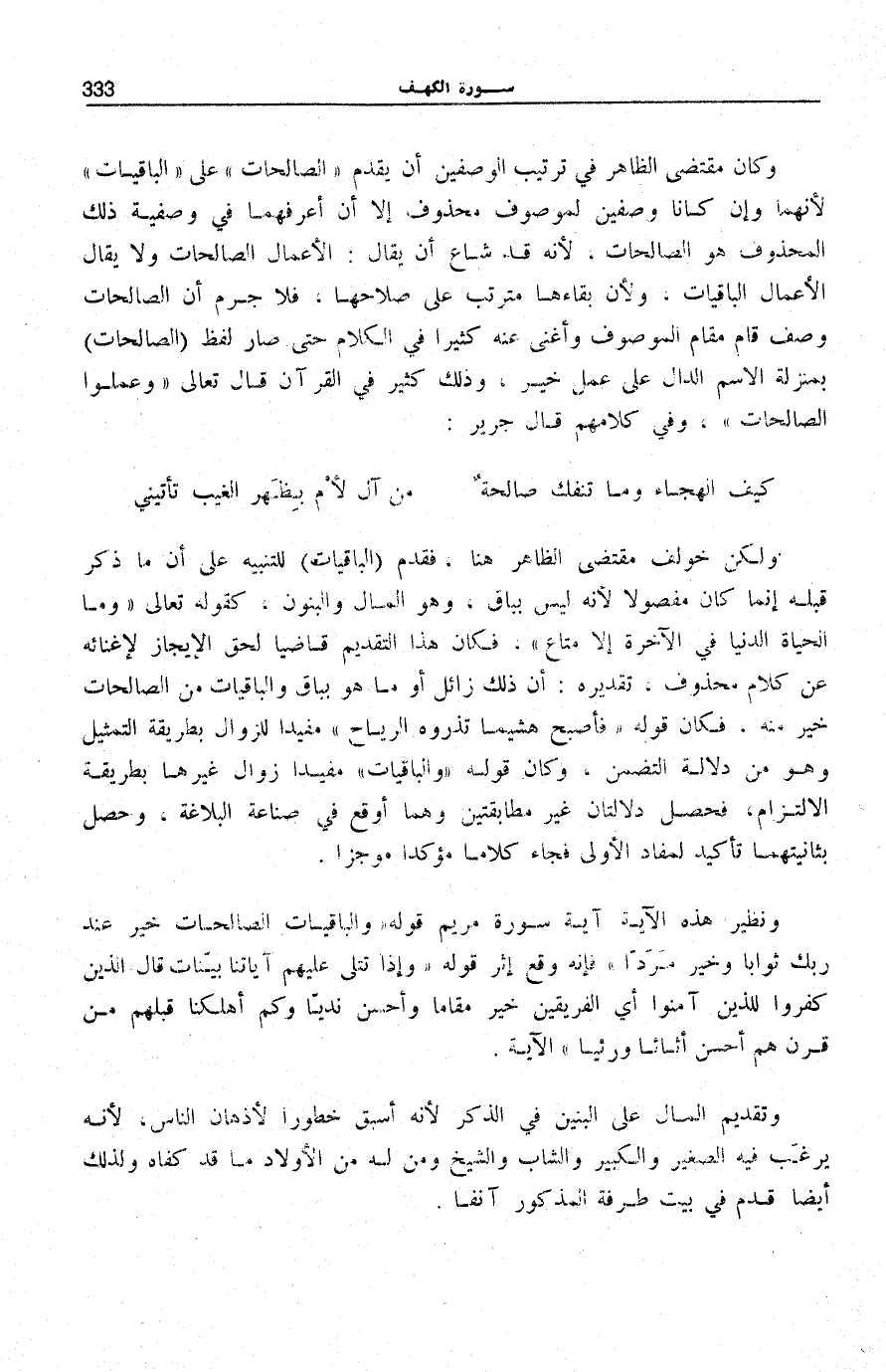 وَلَكِنْ خُولِفَ مُقْتَضَى الظَّاهِرِ هُنَا، فَقُدِّمَ (الْبَاقِيَاتُ) لِلتَّنْبِيهِ عَلَى أَنَّ مَا ذُكِرَ قَبْلَهُ إِنَّمَا كَانَ مَفْصُولًا لِأَنَّهُ لَيْسَ بِبَاقٍ، وَهُوَ الْمَالُ وَالْبَنُونَ، كَقَوْلِهِ تَعَالَى: وَمَا الْحَياةُ الدُّنْيا فِي الْآخِرَةِ إِلَّا مَتاعٌ [الرَّعْد: 26] ، فَكَانَ هَذَا التَّقْدِيمُ قَاضِيًا لِحَقِّ الْإِيجَازِ لِإِغْنَائِهِ عَنْ كَلَامٍ مَحْذُوفٍ، تَقْدِيرُهُ: أَنَّ ذَلِكَ زَائِلٌ أَوْ مَا هُوَ بِبَاقٍ وَالْبَاقِيَاتُ مِنَ الصَّالِحَاتِ خَيْرٌ مِنْهُ، فَكَانَ قَوْلُهُ: فَأَصْبَحَ هَشِيماً تَذْرُوهُ الرِّياحُ [الْكَهْف: 45] مُفِيدًا لِلزَّوَالِ بِطَرِيقَةِ التَّمْثِيلِ وَهُوَ مِنْ دَلَالَةِ التَّضَمُّنِ، وَكَانَ قَوْلُهُ: وَالْباقِياتُ مُفِيدًا زَوَالَ غَيْرِهَا بِطَرِيقَةِ الِالْتِزَامِ، فَحَصَلَ دَلَالَتَانِ غَيْرُ مُطَابِقَتَيْنِ وَهُمَا أَوْقَعُ فِي صِنَاعَةِ الْبَلَاغَةِ، وَحَصَلَ بِثَانِيَتِهِمَا تَأْكِيدٌ لِمُفَادِ الْأُولَى فَجَاءَ كَلَامًا مُؤَكَّدًا مُوجَزًا.