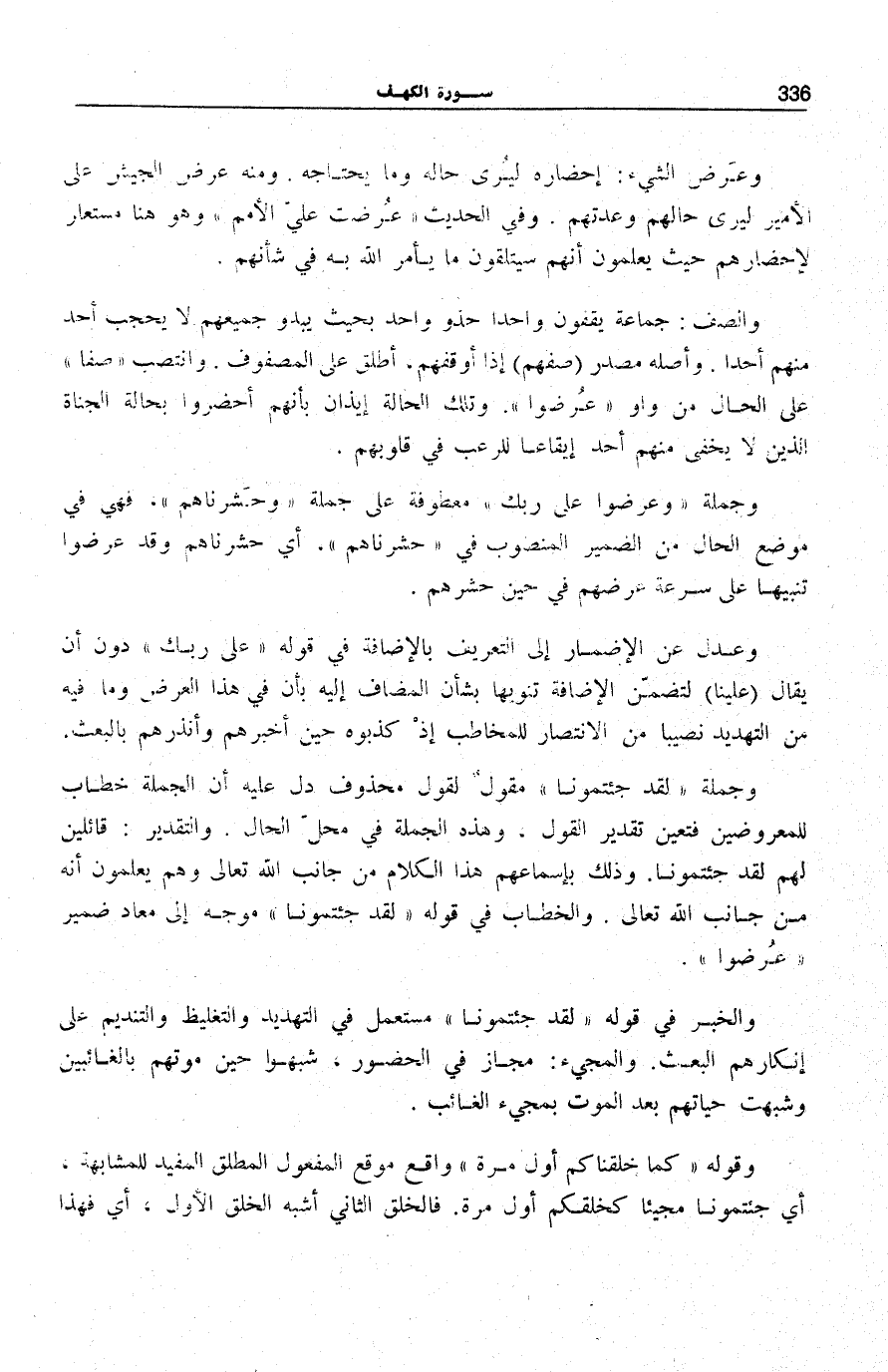 الْحَالِ مِنَ الضَّمِيرِ الْمَنْصُوبِ فِي حَشَرْناهُمْ، أَيْ حَشَرْنَاهُمْ وَقَدْ عُرِضُوا تَنْبِيهًا عَلَى سُرْعَةِ عَرْضِهِمْ فِي حِينِ حَشْرِهِمْ.