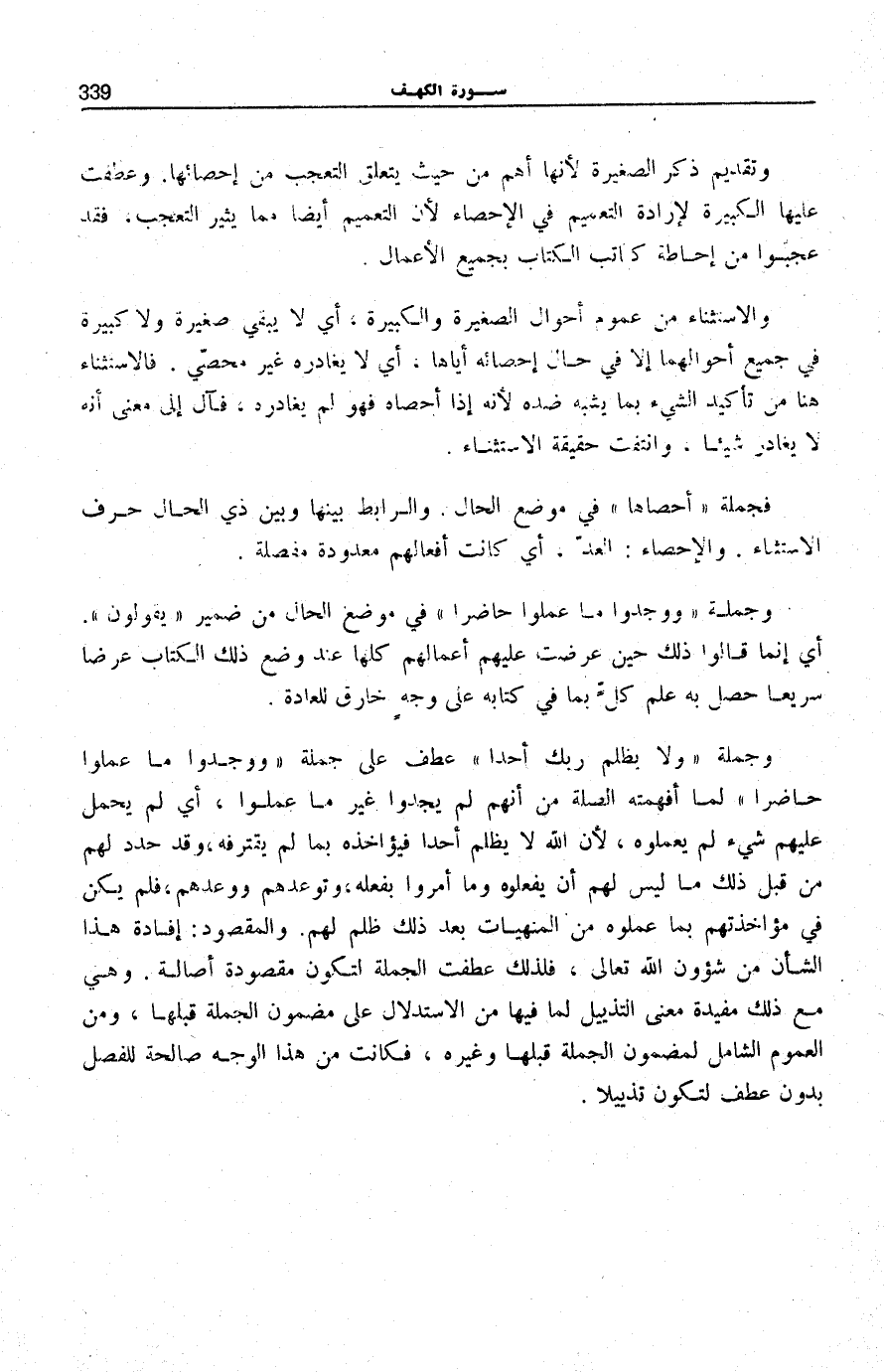 وَالِاسْتِثْنَاءُ مِنْ عُمُومِ أَحْوَالِ الصَّغِيرَةِ وَالْكَبِيرَةِ، أَيْ لَا يُبْقِي صَغِيرَةً وَلَا كَبِيرَةً فِي جَمِيعِ أَحْوَالِهِمَا إِلَّا فِي حَالِ إِحْصَائِهِ إِيَّاهَا، أَيْ لَا يُغَادِرُهُ غَيْرَ مُحْصًى. فَالِاسْتِثْنَاءُ هُنَا مِنْ تَأْكِيدِ الشَّيْءِ بِمَا يُشْبِهُ ضِدَّهُ لِأَنَّهُ إِذَا أَحْصَاهُ فَهُوَ لَمْ يُغَادِرْهُ، فَآلَ إِلَى مَعْنَى أَنَّهُ لَا يُغَادِرُ شَيْئًا، وَانْتَفَتْ حَقِيقَةُ الِاسْتِثْنَاءِ.