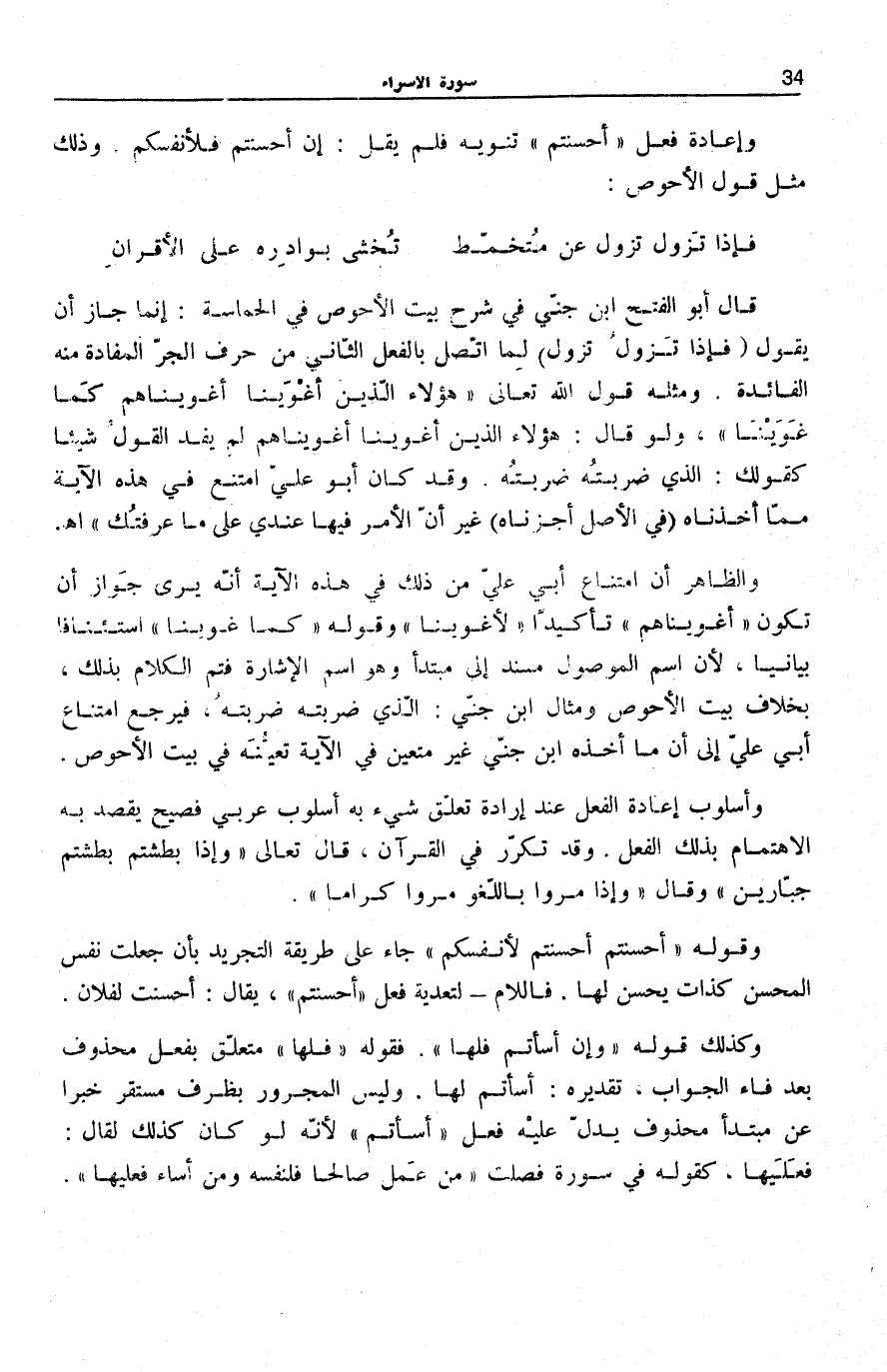 وَإِعَادَةُ فِعْلِ أَحْسَنْتُمْ تَنْوِيهٌ فَلَمْ يَقُلْ: إِنْ أَحْسَنْتُمْ فَلِأَنْفُسِكُمْ. وَذَلِكَ مِثْلُ قَوْلِ الْأَحْوَصِ:
