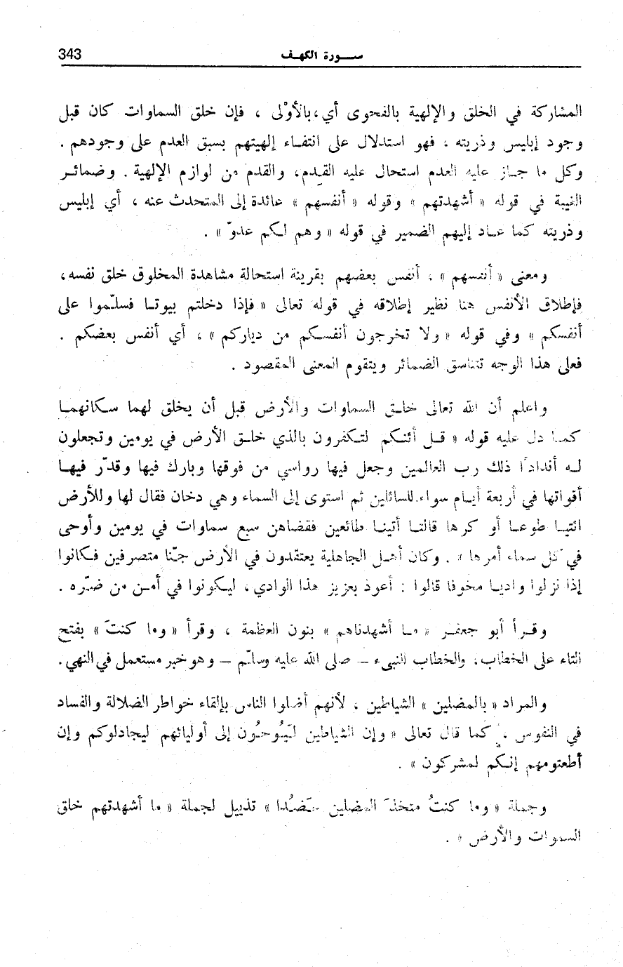 الْمُشَارَكَةِ فِي الْخَلْقِ وَالْإِلَهِيَّةِ بِالْفَحْوَى أَيْ، بِالْأَوْلَى، فَإِنَّ خَلْقَ السَّمَاوَاتِ كَانَ قَبْلَ وُجُودِ إِبْلِيسَ وَذُرِّيَّتِهِ، فَهُوَ اسْتِدْلَالٌ عَلَى انْتِفَاءِ إِلَهِيَّتِهِمْ بِسَبْقِ الْعَدَمِ عَلَى وُجُودِهِمْ. وَكُلُّ مَا جَازَ عَلَيْهِ الْعَدَمُ اسْتَحَالَ عَلَيْهِ الْقِدَمُ، وَالْقِدَمُ مِنْ لَوَازِمَ الْإِلَهِيَّةِ. وَضَمَائِرُ الْغَيْبَةِ فِي قَوْلِهِ: أَشْهَدْتُهُمْ وَقَوْلِهِ: أَنْفُسِهِمْ عَائِدَةٌ إِلَى الْمُتَحَدَّثِ عَنْهُ، أَيْ إِبْلِيسَ وَذُرِّيَّتِهِ كَمَا عَادَ إِلَيْهِمُ الضَّمِيرُ فِي قَوْلِهِ: وَهُمْ لَكُمْ عَدُوٌّ.