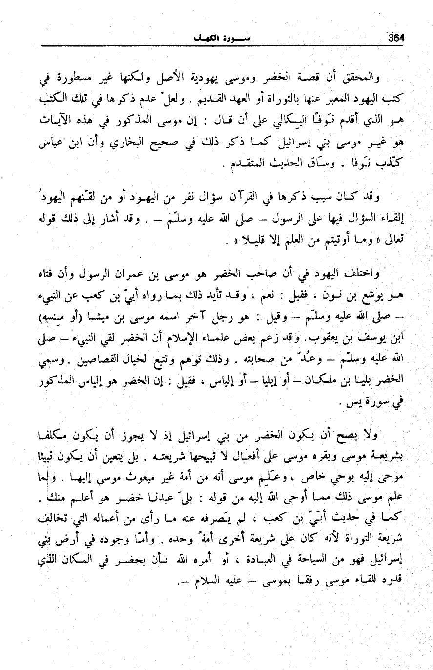 وَالْمُحَقَّقُ أَنَّ قِصَّةَ الْخَضِرِ وَمُوسَى يَهُودِيَّةُ الْأَصْلِ وَلَكِنَّهَا غَيْرُ مَسْطُورَةٍ فِي كُتُبِ الْيَهُودِ الْمُعَبَّرِ عَنْهَا بِالتَّوْرَاةِ أَوِ الْعَهْدِ الْقَدِيمِ. وَلَعَلَّ عَدَمَ ذِكْرِهَا فِي تِلْكَ الْكُتُبِ هُوَ الَّذِي أَقْدَمَ نَوْفًا الْبِكَالِيَّ عَلَى أَنْ قَالَ: إِنَّ مُوسَى الْمَذْكُورَ فِي هَذِهِ الْآيَاتِ هُوَ غَيْرُ مُوسَى بَنِي إِسْرَائِيلَ كَمَا ذُكِرَ ذَلِكَ فِي «صَحِيحِ الْبُخَارِيِّ» وَأَنَّ ابْنَ عَبَّاسٍ كَذَّبَ نَوْفًا، وَسَاقَ الْحَدِيثَ الْمُتَقَدِّمَ.