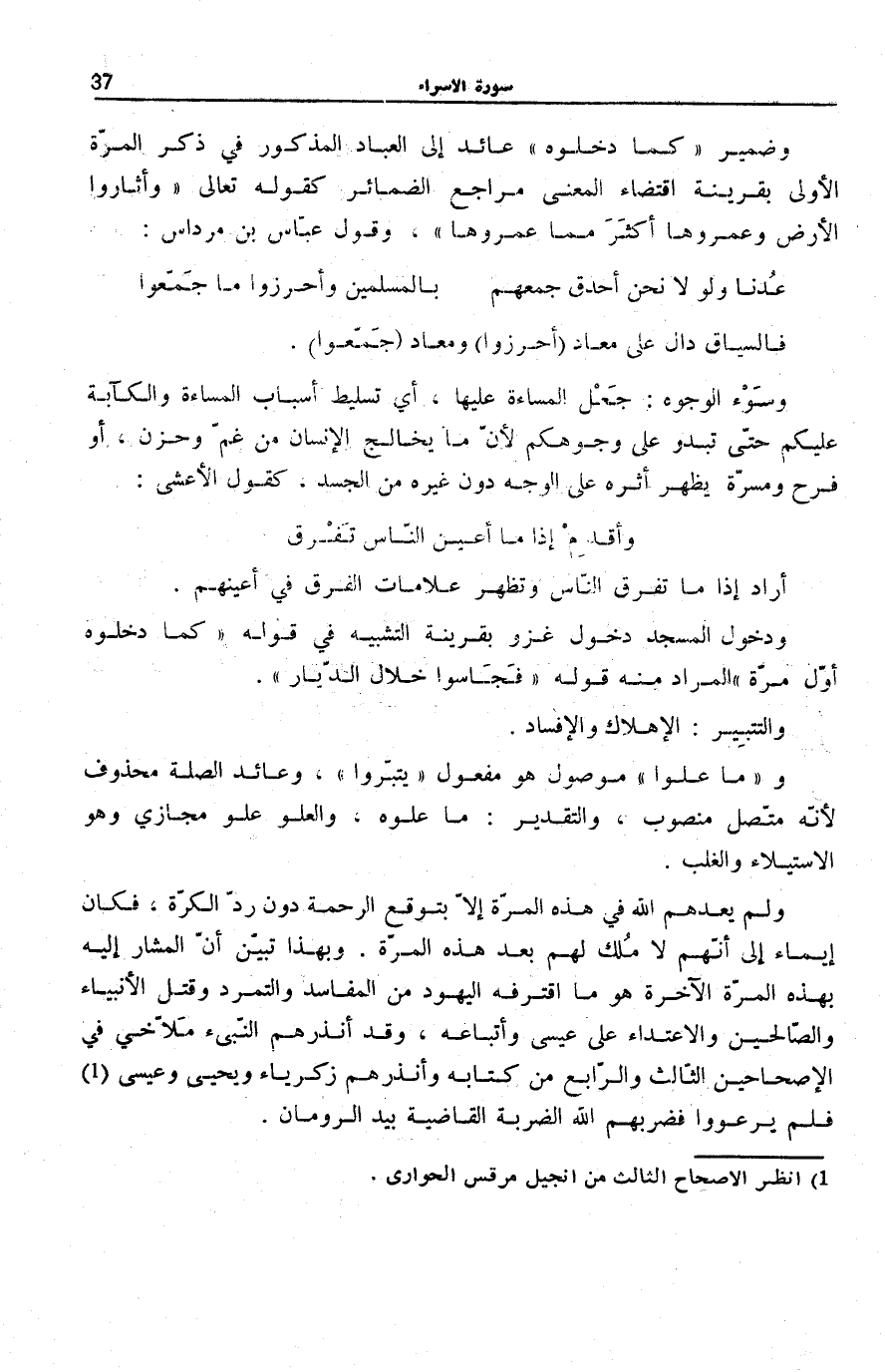 وَلَمْ يَعِدْهُمُ اللَّهُ فِي هَذِهِ الْمَرَّةِ إِلَّا بِتَوَقُّعِ الرَّحْمَةِ دُونَ رَدِّ الْكَرَّةِ، فَكَانَ إِيمَاءً إِلَى أَنَّهُمْ لَا مِلْكَ لَهُمْ بَعْدَ هَذِهِ الْمَرَّةِ. وَبِهَذَا تَبَيَّنَ أَنَّ الْمُشَارَ إِلَيْهِ بِهَذِهِ الْمَرَّةِ الْآخِرَةِ هُوَ مَا اقْتَرَفَهُ الْيَهُودُ مِنَ الْمَفَاسِدِ وَالتَّمَرُّدِ وَقَتْلِ الْأَنْبِيَاءِ وَالصَّالِحِينَ وَالِاعْتِدَاءِ عَلَى عِيسَى وَأَتْبَاعِهِ، وَقَدْ أَنْذَرَهُمُ النَّبِيءُ مَلَّاخِي فِي الْإِصْحَاحَيْنِ الثَّالِثِ وَالرَّابِعِ مِنْ كِتَابِهِ وَأَنْذَرَهُمْ زَكَرِيَّاءُ وَيَحْيَى وَعِيسَى (¬1) فَلَمْ يَرْعَوُوا فَضَرَبَهُمُ اللَّهُ الضَّرْبَةَ الْقَاضِيَةَ بِيَدِ الرُّومَانِ.
