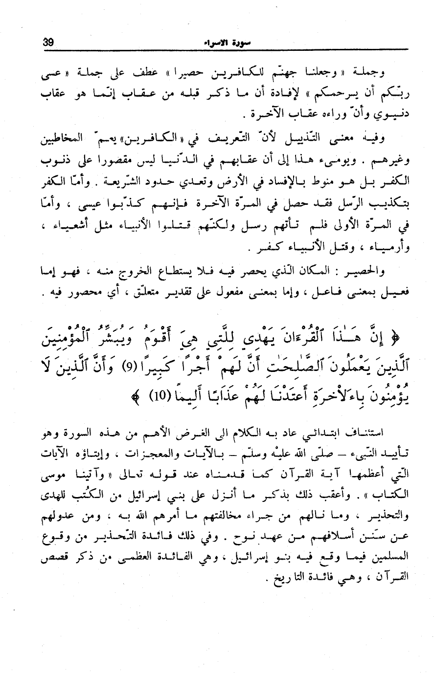إِنَّ هذَا الْقُرْآنَ يَهْدِي لِلَّتِي هِيَ أَقْوَمُ وَيُبَشِّرُ الْمُؤْمِنِينَ الَّذِينَ يَعْمَلُونَ الصَّالِحاتِ أَنَّ لَهُمْ أَجْراً كَبِيراً (9) وَأَنَّ الَّذِينَ لَا يُؤْمِنُونَ بِالْآخِرَةِ أَعْتَدْنا لَهُمْ عَذاباً أَلِيماً (10)