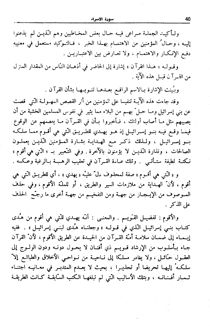 والأقوم: تَفْضِيل الْقَوِيمِ. وَالْمَعْنَى: أَنَّهُ يَهْدِي لِلَّتِي هِيَ أَقْوَمُ مِنْ هُدَى كِتَابِ بَنِي إِسْرَائِيلَ الَّذِي فِي قَوْلِهِ: وَجَعَلْناهُ هُدىً لِبَنِي إِسْرائِيلَ [الْإِسْرَاء: 2] . فَفِيهِ إِيمَاءٌ إِلَى ضَمَانِ سَلَامَةِ أُمَّةِ الْقُرْآنِ مِنَ الْحَيْدَةِ عَنِ الطَّرِيقِ الْأَقْوَمِ، لِأَنَّ الْقُرْآنَ جَاءَ بِأُسْلُوبٍ مِنَ الْإِرْشَادِ قَوِيمٍ ذِي أَفْنَانٍ لَا يَحُولُ دُونَهُ وَدُونَ الْوُلُوجِ إِلَى الْعُقُولِ حَائِلٌ، وَلَا يُغَادِرُ مَسْلَكًا إِلَى نَاحِيَةٍ مِنْ نَوَاحِي الْأَخْلَاقِ وَالطَّبَائِعِ إِلَّا سَلَكَهُ إِلَيْهَا تَحْرِيضًا أَوْ تَحْذِيرًا، بِحَيْثُ لَا يَعْدَمُ