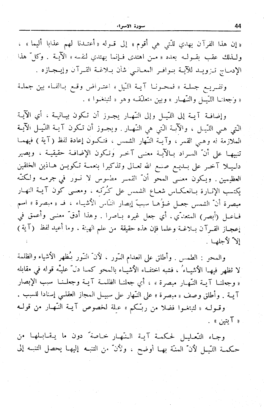 وَإِضَافَةُ آيَةٍ إِلَى اللَّيْلِ وَإِلَى النَّهَارِ يَجُوزُ أَنْ تَكُونَ بَيَانِيَّةً، أَيِ الْآيَةُ الَّتِي هِيَ اللَّيْلُ، وَالْآيَة الَّتِي هِيَ النَّهَارُ. وَيَجُوزُ أَنْ تَكُونَ آيَةُ اللَّيْلِ الْآيَةَ الْمُلَازِمَةَ لَهُ وَهِيَ الْقَمَرُ، وَآيَةُ النَّهَارِ الشَّمْسُ، فَتَكُونُ إِعَادَةُ لَفْظِ (آيَةٍ) فِيهِمَا تَنْبِيهًا عَلَى أَنَّ الْمُرَادَ بِالْآيَةِ مَعْنًى آخَرُ وَتَكُونُ الْإِضَافَةُ حَقِيقِيَّةً، وَيَصِيرُ دَلِيلًا آخَرَ عَلَى بَدِيعِ صُنْعِ اللَّهِ تَعَالَى وَتَذْكِيرًا بِنِعْمَةِ تَكْوِينِ هَذَيْنِ الْخَلْقَيْنِ الْعَظِيمَيْنِ. وَيَكُونُ مَعْنَى الْمَحْوِ أَنَّ الْقَمَرَ مَطْمُوسٌ لَا نُورَ فِي جِرْمِهِ وَلَكِنَّهُ يَكْتَسِبُ الْإِنَارَةَ بِانْعِكَاسِ شُعَاعِ الشَّمْسِ عَلَى كُرَتِهِ، وَمَعْنَى كَوْنِ آيَةِ النَّهَارِ مُبْصِرَةً أَنَّ الشَّمْس جعل ضوؤها سَبَبَ إِبْصَارِ النَّاسِ الْأَشْيَاءَ، ف مُبْصِرَةً اسْمُ فَاعِلِ (أَبْصَرَ) الْمُتَعَدِّي، أَيْ جَعَلَ غَيْرَهُ بَاصِرًا. وَهَذَا أَدَقُّ مَعْنًى وَأَعْمَقُ فِي إِعْجَازِ الْقُرْآنِ بَلَاغَةً وَعِلْمًا فَإِنَّ هَذِهِ حَقِيقَةٌ مِنْ عِلْمِ الْهَيْئَةِ، وَمَا أُعِيدَ لَفْظُ (آيَةٍ) إِلَّا لِأَجْلِهَا.