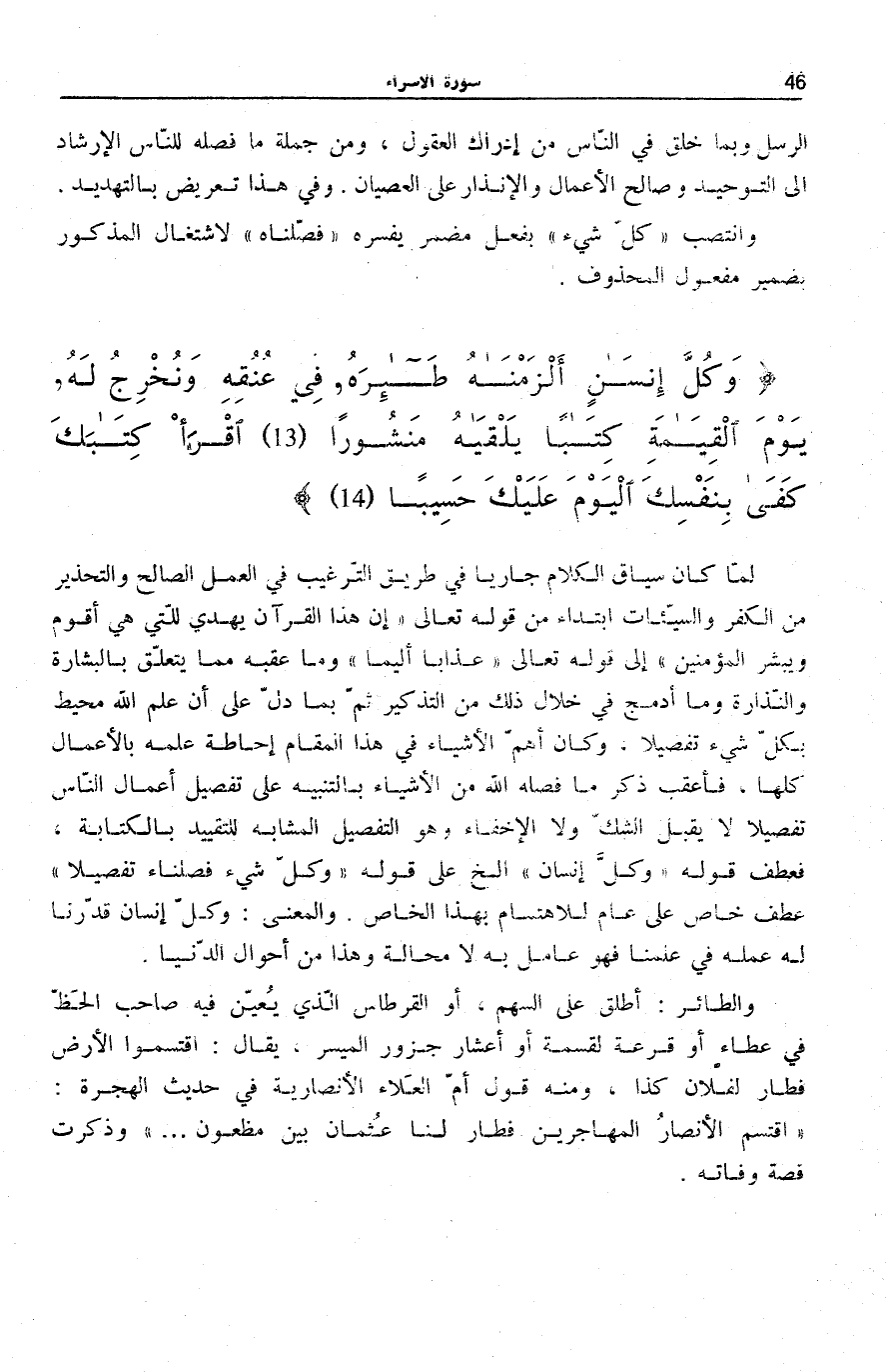 لَمَّا كَانَ سِيَاقُ الْكَلَامِ جَارِيًا فِي طَرِيقِ التَّرْغِيبِ فِي الْعَمَلِ الصَّالِحِ وَالتَّحْذِيرِ مِنَ الْكُفْرِ وَالسَّيِّئَاتِ ابْتِدَاءً مِنْ قَوْلِهِ تَعَالَى: إِنَّ هذَا الْقُرْآنَ يَهْدِي لِلَّتِي هِيَ أَقْوَمُ وَيُبَشِّرُ الْمُؤْمِنِينَ إِلَى قَوْلِهِ تَعَالَى: عَذاباً أَلِيماً [الْإِسْرَاء: 9- 10] وَمَا عَقَّبَهُ مِمَّا يَتَعَلَّقُ بِالْبِشَارَةِ وَالنِّذَارَةِ وَمَا أُدْمِجَ فِي خِلَالِ ذَلِكَ مِنَ التَّذْكِيرِ ثَمَّ بِمَا دَلَّ عَلَى أَنَّ عِلْمَ اللَّهِ مُحِيطٌ بِكُلِّ شَيْءٍ تَفْصِيلًا، وَكَانَ أَهَمُّ الْأَشْيَاءِ فِي هَذَا الْمَقَامِ إِحَاطَةَ عِلْمِهِ بِالْأَعْمَالِ كُلِّهَا، فَأَعْقَبَ ذِكْرَ مَا فَصَّلَهُ اللَّهُ مِنَ الْأَشْيَاءِ بِالتَّنْبِيهِ عَلَى تَفْصِيلِ أَعْمَالِ النَّاسِ تَفْصِيلًا لَا يَقْبَلُ الشَّكَّ وَلَا الْإِخْفَاءَ وَهُوَ التَّفْصِيلُ الْمُشَابِهُ لِلتَّقْيِيدِ بِالْكِتَابَةِ، فَعَطْفُ قَوْلِهِ: وَكُلَّ إِنسانٍ إِلَخْ عَلَى قَوْلِهِ: وَكُلَّ شَيْءٍ فَصَّلْناهُ تَفْصِيلًا [الْإِسْرَاء: 12] عَطْفٌ خَاصٌّ عَلَى عَامٍّ لِلِاهْتِمَامِ بِهَذَا الْخَاصِّ. وَالْمَعْنَى: وَكُلَّ إِنْسَانٍ قَدَّرْنَا لَهُ عمله فِي علمنَا فَهُوَ عَامِلٌ بِهِ لَا مَحَالَةَ وَهَذَا مِنْ أَحْوَالِ الدُّنْيَا.