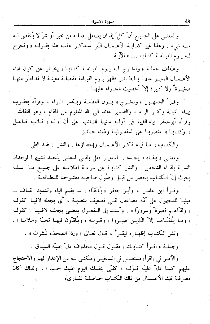وَالْمَعْنَى عَلَى الْجَمِيعِ أَنَّ كُلَّ إِنْسَانٍ يُعَامَلُ بِعَمَلِهِ مِنْ خَيْرٍ أَوْ شَرٍّ لَا يَنْقُصُ لَهُ مِنْهُ شَيْءٌ. وَهَذَا غَيْرُ كِتَابَةِ الْأَعْمَالِ الَّتِي سَتُذْكَرُ عَقِبَ هَذَا بِقَوْلِهِ: وَنُخْرِجُ لَهُ يَوْمَ الْقِيامَةِ كِتاباً الْآيَةَ.