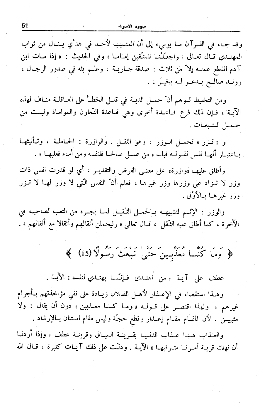 وَما كُنَّا مُعَذِّبِينَ حَتَّى نَبْعَثَ رَسُولًا عَطْفٌ عَلَى آيَةِ مَنِ اهْتَدى فَإِنَّما يَهْتَدِي لِنَفْسِهِ الْآيَةَ.