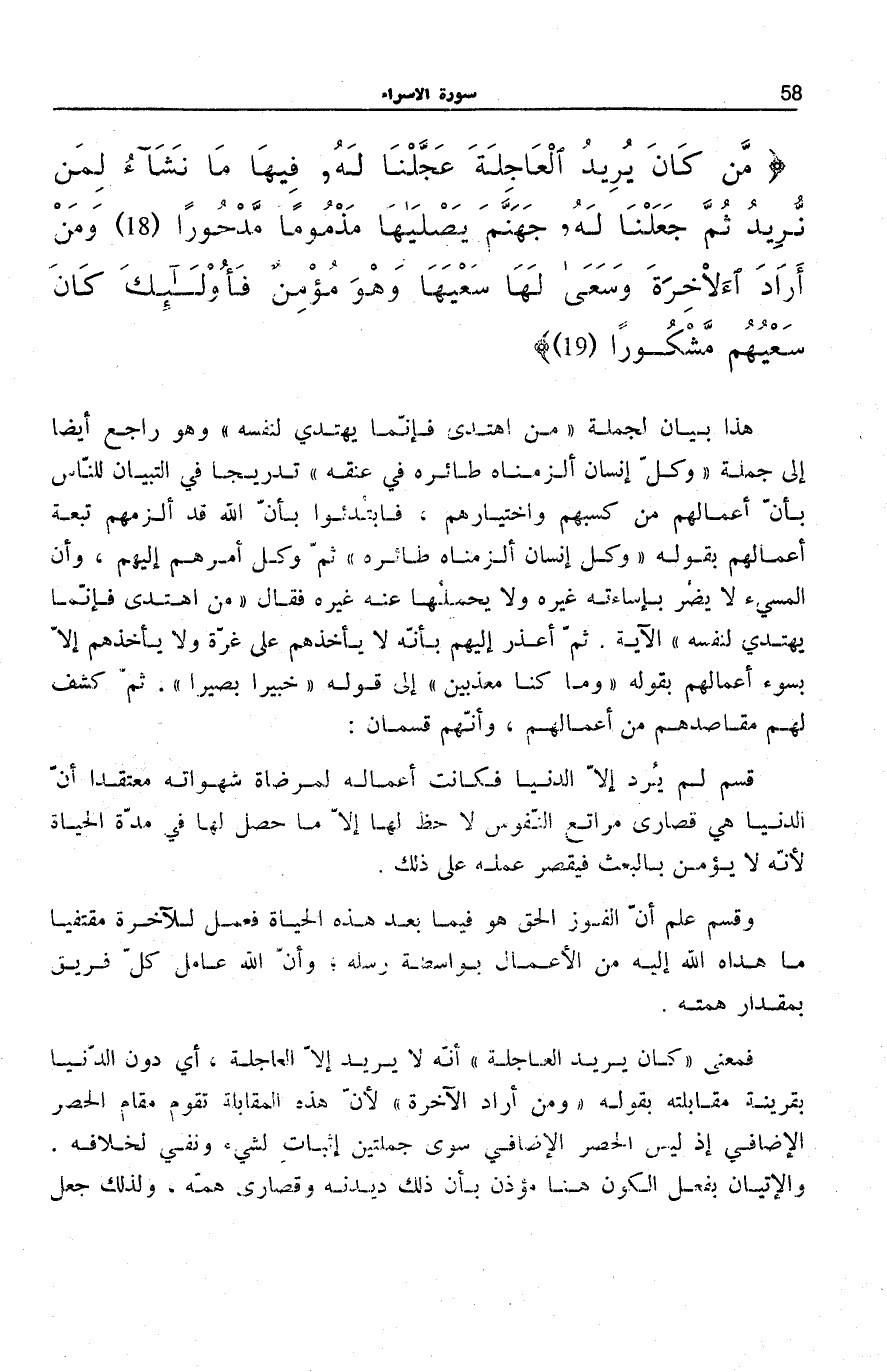مَنْ كانَ يُرِيدُ الْعاجِلَةَ عَجَّلْنا لَهُ فِيها مَا نَشاءُ لِمَنْ نُرِيدُ ثُمَّ جَعَلْنا لَهُ جَهَنَّمَ يَصْلاها مَذْمُوماً مَدْحُوراً (18) وَمَنْ أَرادَ الْآخِرَةَ وَسَعى لَها سَعْيَها وَهُوَ مُؤْمِنٌ فَأُولئِكَ كانَ سَعْيُهُمْ مَشْكُوراً (19)