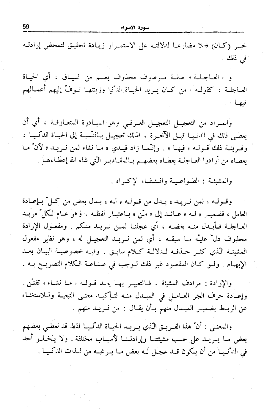 وَقَوْلُهُ: لِمَنْ نُرِيدُ بَدَلٌ مِنْ قَوْلِهِ: لَهُ بَدَلَ بَعْضٍ مِنْ كُلٍّ بِإِعَادَةِ الْعَامِلِ، فَضَمِيرُ لَهُ عَائِدٌ إِلَى مَنْ بِاعْتِبَارِ لَفْظِهِ، وَهُوَ عَامٌّ لِكُلِّ مُرِيدِ الْعَاجِلَةِ فَأُبْدِلَ مِنْهُ بَعْضُهُ، أَيْ عَجَّلْنَا لِمَنْ نُرِيدُ مِنْكُمْ، وَمَفْعُولُ الْإِرَادَةِ مَحْذُوفٌ دَلَّ عَلَيْهِ مَا سَبَقَهُ، أَيْ لِمَنْ نُرِيدُ التَّعْجِيلَ لَهُ، وَهُوَ نَظِيرُ مَفْعُولِ الْمَشِيئَةِ الَّذِي كَثُرَ حَذْفُهُ لِدَلَالَةِ كَلَامٍ سَابِقٍ. وَفِيهِ خُصُوصِيَّةُ الْبَيَانِ بَعْدَ الْإِبْهَامِ. وَلَوْ كَانَ الْمَقْصُودُ غَيْرَ ذَلِكَ لَوَجَبَ فِي صِنَاعَةِ الْكَلَامِ التَّصْرِيحُ بِهِ.