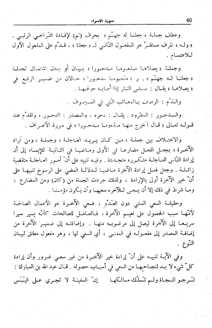 وَالِاخْتِلَافُ بَيْنَ جُمْلَةِ مَنْ كانَ يُرِيدُ الْعاجِلَةَ وَجُمْلَةِ وَمَنْ أَرادَ الْآخِرَةَ بِجعْل الْفِعْلَ مُضَارِعًا فِي الْأُولَى وَمَاضِيًا فِي الثَّانِيَةِ لِلْإِيمَاءِ إِلَى أَنَّ إِرَادَةَ النَّاسِ الْعَاجِلَةَ مُتَكَرِّرَةٌ مُتَجَدِّدَةٌ. وَفِيهِ تَنْبِيهٌ عَلَى أَنَّ أُمُورَ الْعَاجِلَةِ مُتَقَضِّيَةٌ زَائِلَةٌ، وَجَعَلَ فِعْلَ إِرَادَةِ الْآخِرَةِ، مَاضِيًا لِدَلَالَةِ الْمُضِيِّ عَلَى الرُّسُوخِ تَنْبِيهًا عَلَى أَنَّ خَيْرَ الْآخِرَةِ أَوْلَى بِالْإِرَادَةِ، وَلِذَلِكَ جُرِّدَتِ الْجُمْلَةُ مِنْ (كَانَ) وَمِنَ الْمُضَارِعِ، وَمَا شَرَطَ فِي ذَلِكَ إِلَّا أَنْ يَسْعَى لِلْآخِرَةِ سَعْيَهَا وَأَنْ يَكُونَ مُؤْمِنًا.