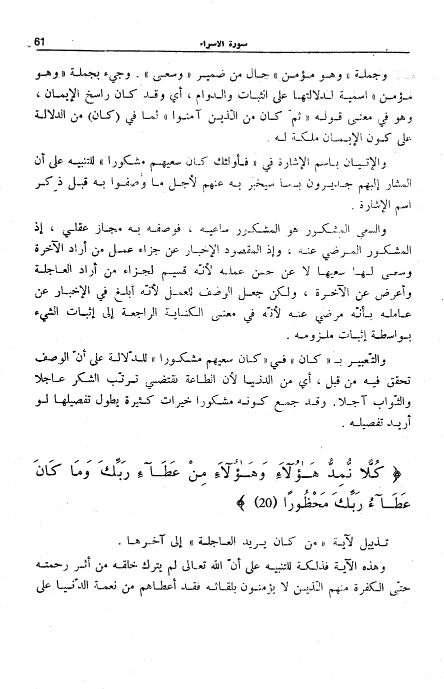 وَالسَّعْيُ الْمَشْكُورُ هُوَ الْمَشْكُورُ سَاعِيهِ، فَوَصْفُهُ بِهِ مَجَازٌ عَقْلِيٌّ، إِذِ الْمَشْكُورُ الْمَرْضِيُّ عَنْهُ، وَإِذِ الْمَقْصُودُ الْإِخْبَارُ عَنْ جَزَاءِ عَمَلِ مَنْ أَرَادَ الْآخِرَةَ وَسَعَى لَهَا سَعْيَهَا لَا عَنْ حُسْنِ عَمَلِهِ لِأَنَّهُ قَسِيمٌ لِجَزَاءِ مَنْ أَرَادَ الْعَاجِلَةَ وَأَعْرَضَ عَنِ الْآخِرَةِ، وَلَكِنْ جَعَلَ الْوَصْفَ لِلْعَمَلِ لِأَنَّهُ أَبْلَغُ فِي الْإِخْبَارِ عَنْ عَامِلِهِ بِأَنَّهُ مَرْضِيٌّ عَنْهُ لِأَنَّهُ فِي مَعْنَى الْكِنَايَةِ الرَّاجِعَةِ إِلَى إِثْبَاتِ الشَّيْءِ بِوَاسِطَةِ إِثْبَاتِ مَلْزُومِهِ.