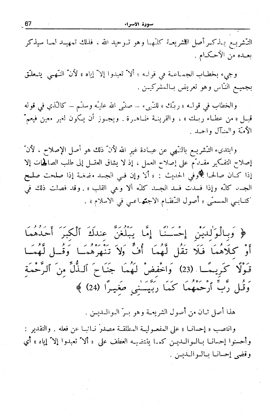 وَبِالْوالِدَيْنِ إِحْساناً إِمَّا يَبْلُغَنَّ عِنْدَكَ الْكِبَرَ أَحَدُهُما أَوْ كِلاهُما فَلا تَقُلْ لَهُما أُفٍّ وَلا تَنْهَرْهُما وَقُلْ لَهُما قَوْلًا كَرِيماً وَاخْفِضْ لَهُما جَناحَ الذُّلِّ مِنَ الرَّحْمَةِ وَقُلْ رَبِّ ارْحَمْهُما كَما رَبَّيانِي صَغِيراً
