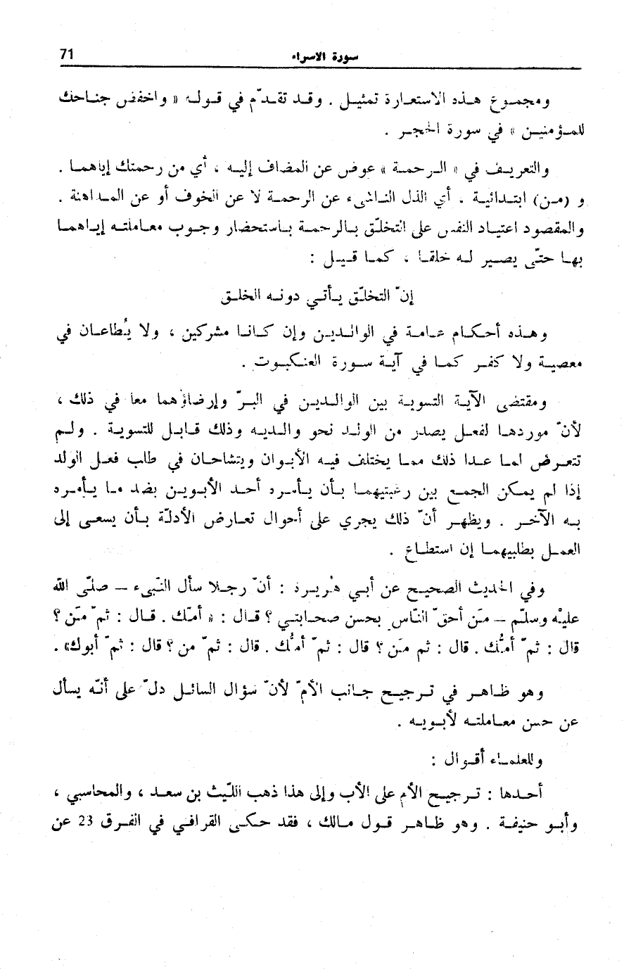 . وَهُوَ ظَاهِرٌ فِي تَرْجِيحِ جَانِبِ الْأُمِّ لِأَنَّ سُؤَالَ السَّائِلِ دَلَّ عَلَى أَنَّهُ يَسْأَلُ عَنْ حُسْنِ مُعَامَلَتِهِ لِأَبَوَيْهِ.
