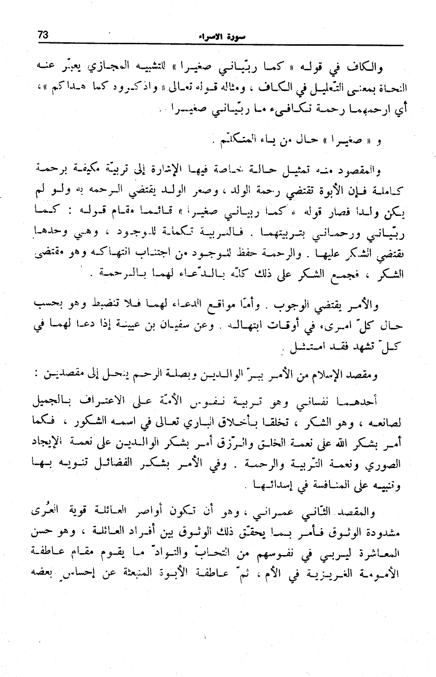 وَالْمَقْصُودُ مِنْهُ تَمْثِيلُ حَالَةٍ خَاصَّةٍ فِيهَا الْإِشَارَةُ إِلَى تَرْبِيَةٍ مُكَيَّفَةٍ بِرَحْمَةٍ كَامِلَةٍ فَإِنَّ الْأُبُوَّةَ تَقْتَضِي رَحْمَة الْوَلَد، وَصِغَرَ الْوَلَدِ يَقْتَضِي الرَّحْمَةَ بِهِ وَلَوْ لَمْ يَكُنْ وَلَدًا فَصَارَ قَوْلُهُ: كَما رَبَّيانِي صَغِيراً قَائِمًا مَقَامَ قَوْلِهِ كَمَا رَبَّيَانِي وَرَحِمَانِي بِتَرْبِيَتِهِمَا. فَالتَّرْبِيَةُ تَكْمِلَةٌ لِلْوُجُودِ، وَهِيَ وَحْدَهَا تَقْتَضِي الشُّكْرَ عَلَيْهَا. وَالرَّحْمَةُ حِفْظٌ لِلْوُجُودِ مِنِ اجْتِنَابِ انْتِهَاكِهِ وَهُوَ مُقْتَضَى الشُّكْرِ، فَجَمَعَ الشُّكْرَ عَلَى ذَلِكَ كُلِّهِ بِالدُّعَاءِ لَهُمَا بِالرَّحْمَةِ.