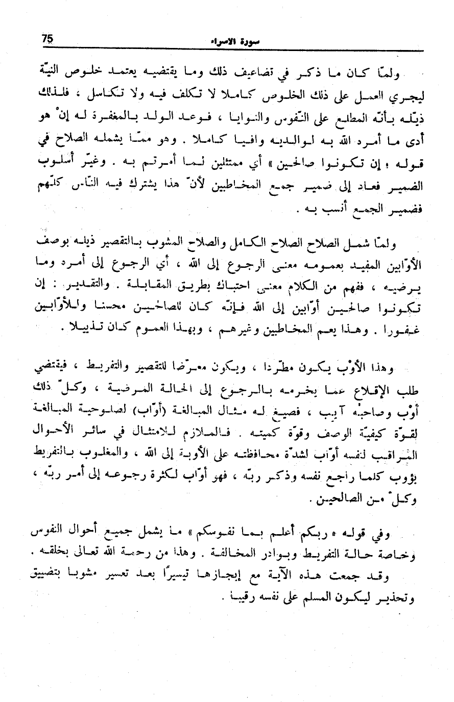 عَلَى ذَلِكَ الْخُلُوصِ كَامِلًا لَا تَكَلُّفَ فِيهِ وَلَا تَكَاسُلَ، فَلِذَلِكَ ذَيَّلَهُ بِأَنَّهُ الْمُطَّلِعُ عَلَى النُّفُوسِ وَالنَّوَايَا، فَوَعَدَ الْوَلَدَ بِالْمَغْفِرَةِ لَهُ إِنْ هُوَ أَدَّى مَا أَمَرَهُ اللَّهُ بِهِ لِوَالِدَيْهِ وَافِيًا كَامِلًا. وَهُوَ مِمَّا يَشْمَلُهُ الصَّلَاحُ فِي قَوْلِهِ: إِنْ تَكُونُوا صالِحِينَ أَيْ مُمْتَثِلِينَ لِمَا أُمِرْتُمْ بِهِ. وَغُيِّرَ أُسْلُوبُ الضَّمِيرِ فَعَادَ إِلَى ضَمِيرِ جَمْعِ الْمُخَاطَبِينَ لِأَنَّ هَذَا يَشْتَرِكُ فِيهِ النَّاسُ كُلُّهُمْ فَضَمِيرُ الْجَمْعِ أَنْسَبُ بِهِ.