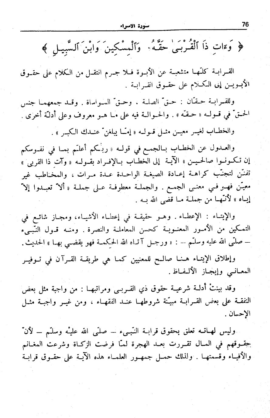وَآتِ ذَا الْقُرْبى حَقَّهُ وَالْمِسْكِينَ وَابْنَ السَّبِيلِ.