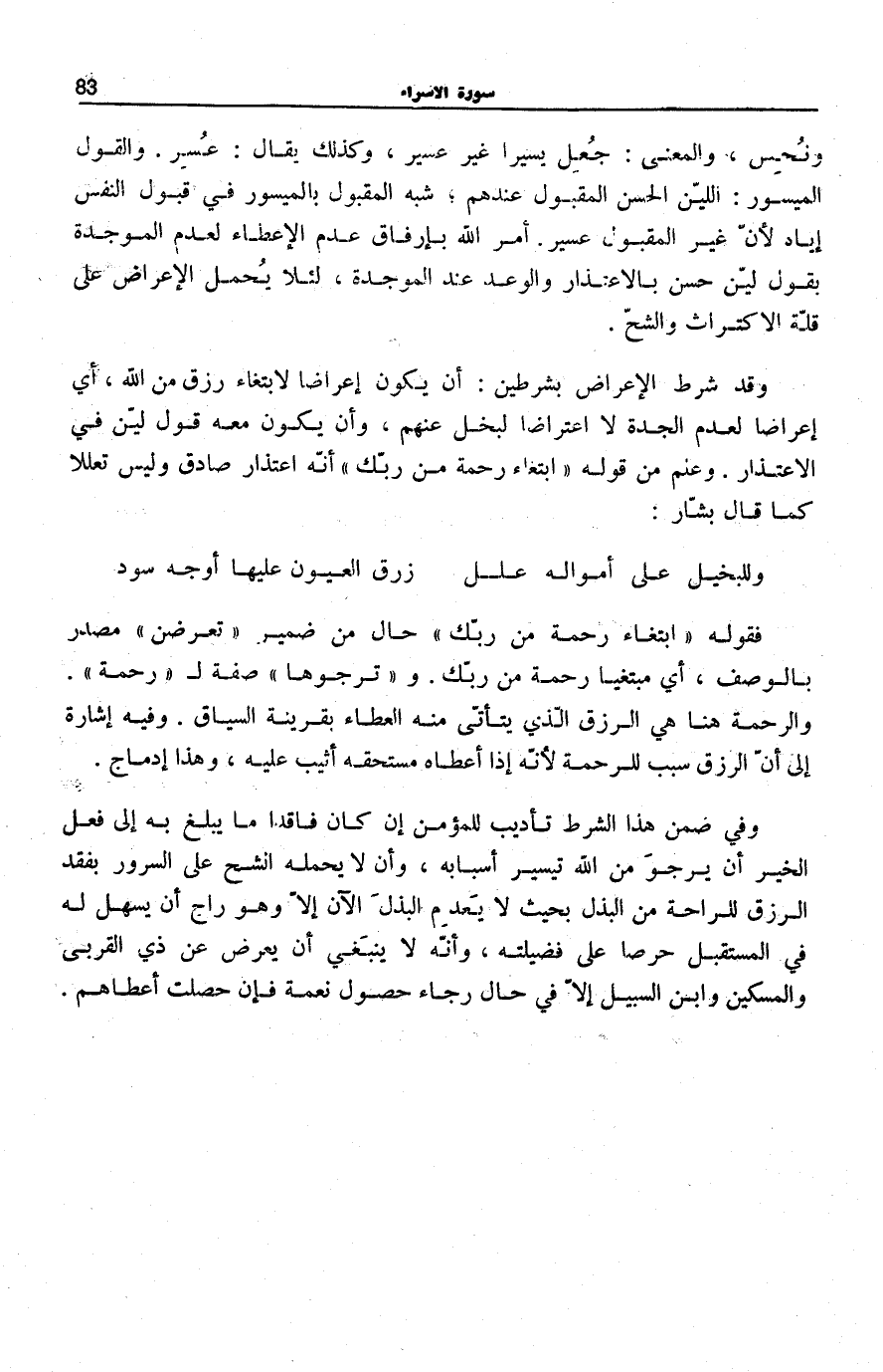 وَقَدْ شَرَطَ الْإِعْرَاضَ بِشَرْطَيْنِ: أَنْ يَكُونَ إِعْرَاضًا لِابْتِغَاءِ رِزْقٍ مِنَ اللَّهِ، أَيْ إِعْرَاضًا لِعَدَمِ الْجِدَةِ لَا اعْتِرَاضًا لِبُخْلٍ عَنْهُمْ، وَأَنْ يَكُونَ مَعَهُ قَوْلٌ لَيِّنٌ فِي الِاعْتِذَارِ. وَعُلِمَ مِنْ قَوْلِهِ: ابْتِغاءَ رَحْمَةٍ مِنْ رَبِّكَ أَنَّهُ اعْتِذَارٌ صَادِقٌ وَلَيْسَ تَعَلُّلًا كَمَا قَالَ بَشَّارٌ: