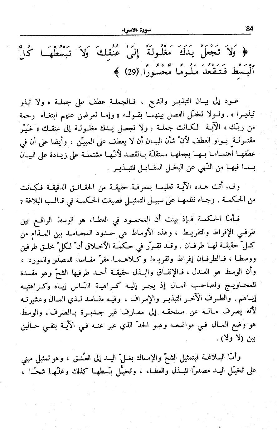 وَلا تَجْعَلْ يَدَكَ مَغْلُولَةً إِلى عُنُقِكَ وَلا تَبْسُطْها كُلَّ الْبَسْطِ فَتَقْعُدَ مَلُوماً مَحْسُوراً (29)