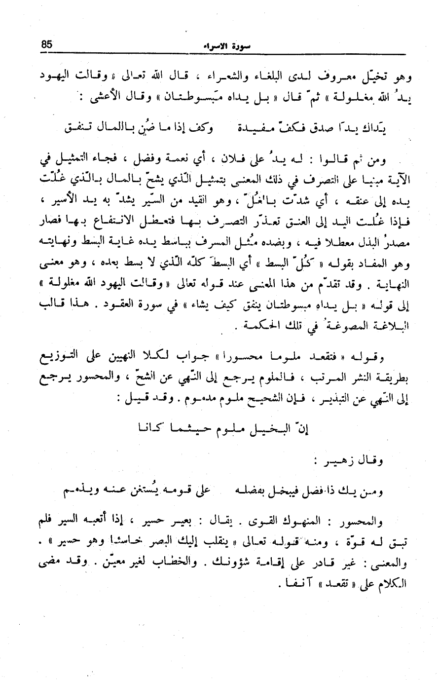 التَّصَرُّفِ فِي ذَلِكَ الْمَعْنَى بِتَمْثِيلِ الَّذِي يَشِحُّ بِالْمَالِ بِالَّذِي غُلَّتْ يَدُهُ إِلَى عُنُقِهِ، أَيْ شُدَّتْ بِالْغُلِّ، وَهُوَ الْقَيْدُ مِنَ السَّيْرِ يشد بِهِ يَد الْأَسِيرُ، فَإِذَا غُلَّتِ الْيَدُ إِلَى الْعُنُقِ تَعَذَّرَ التَّصَرُّفُ بِهَا فَتَعَطَّلَ الِانْتِفَاعُ بِهَا فَصَارَ مَصْدَرُ الْبَذْلِ مُعَطَّلًا فِيهِ، وَبِضِدِّهِ مِثْلَ الْمُسْرِفِ بِبَاسِطِ يَدِهِ غَايَةَ الْبَسْطِ وَنِهَايَتَهُ وَهُوَ المفاد بقوله: كُلَّ الْبَسْطِ أَيِ الْبَسْطَ كُلَّهُ الَّذِي لَا بَسْطَ بَعْدَهُ، وَهُوَ مَعْنَى النِّهَايَةِ. وَقَدْ تَقَدَّمَ مِنْ هَذَا الْمَعْنى عِنْد قَوْلُهُ تَعَالَى: وَقالَتِ الْيَهُودُ يَدُ اللَّهِ مَغْلُولَةٌ إِلَى قَوْلِهِ: بَلْ يَداهُ مَبْسُوطَتانِ يُنْفِقُ كَيْفَ يَشاءُ فِي سُورَة الْعُقُود [الْمَائِدَة: 64] . هَذَا قَالَبُ الْبَلَاغَةِ الْمَصُوغَةِ فِي تِلْكَ الْحِكْمَةِ.