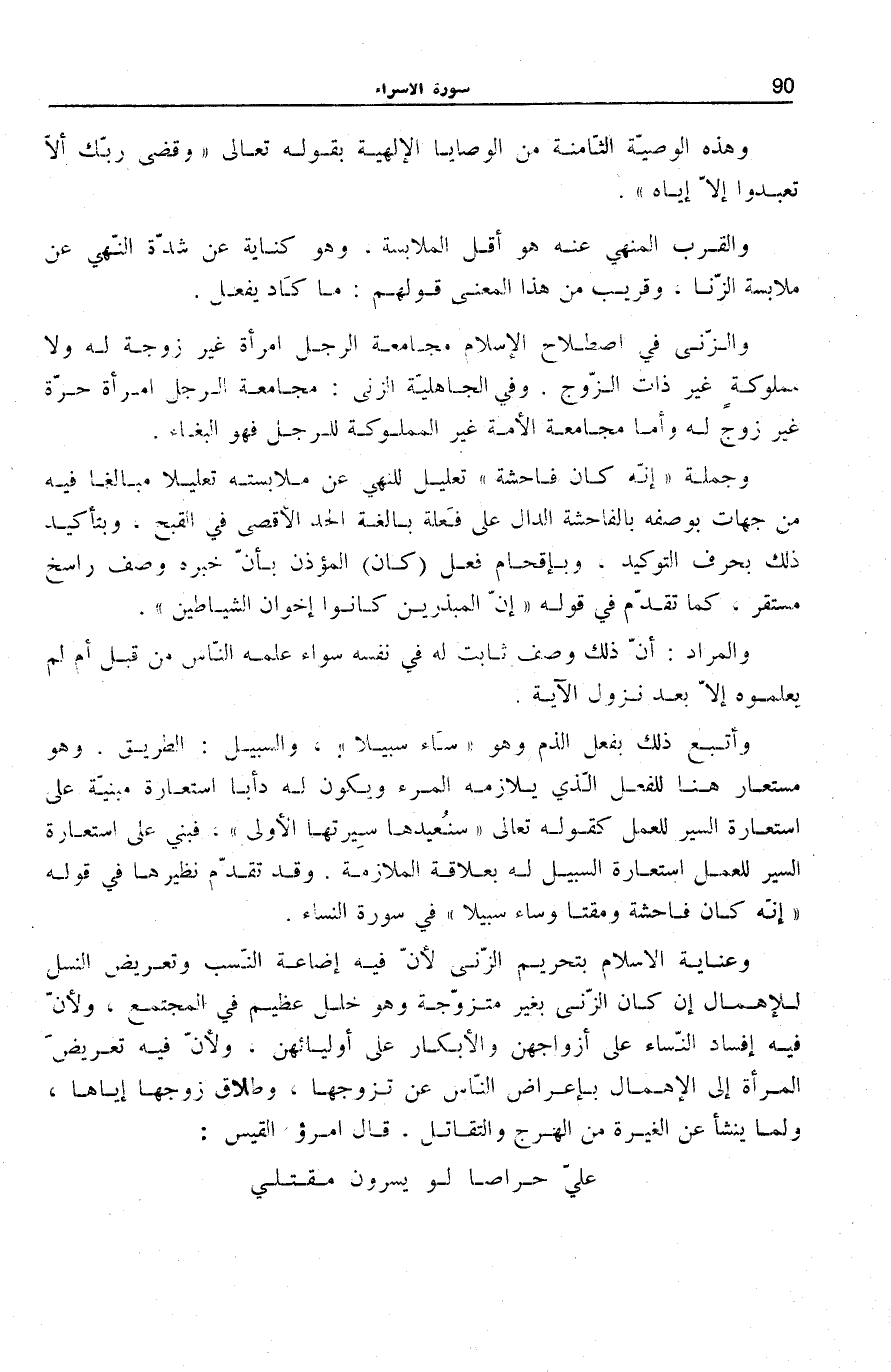 وَعِنَايَةُ الْإِسْلَامِ بِتَحْرِيمِ الزِّنَى لِأَنَّ فِيهِ إِضَاعَةَ النَّسَبِ وَتَعْرِيضَ النَّسْلِ لِلْإِهْمَالِ إِنْ كَانَ الزِّنَى بِغَيْرِ مُتَزَوِّجَةٍ وَهُوَ خَلَلٌ عَظِيمٌ فِي الْمُجْتَمَعِ، وَلِأَنَّ فِيهِ إِفْسَادَ النِّسَاءِ عَلَى أَزْوَاجِهِنَّ وَالْأَبْكَارِ عَلَى أَوْلِيَائِهِنَّ، وَلِأَنَّ فِيهِ تَعْرِيضَ الْمَرْأَةِ إِلَى الْإِهْمَالِ بِإِعْرَاضِ النَّاسِ عَنْ تَزَوُّجِهَا، وَطَلَاقِ زَوْجِهَا إِيَّاهَا، وَلِمَا يَنْشَأُ عَنِ الْغَيْرَةِ مِنَ الْهَرْجِ وَالتَّقَاتُلِ، قَالَ امْرُؤُ الْقَيْسِ:
