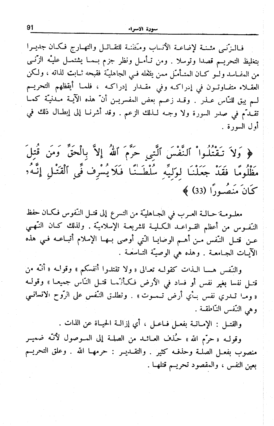 وَلا تَقْتُلُوا النَّفْسَ الَّتِي حَرَّمَ اللَّهُ إِلاَّ بِالْحَقِّ وَمَنْ قُتِلَ مَظْلُوماً فَقَدْ جَعَلْنا لِوَلِيِّهِ سُلْطاناً فَلا يُسْرِفْ فِي الْقَتْلِ إِنَّهُ كانَ مَنْصُوراً (33)