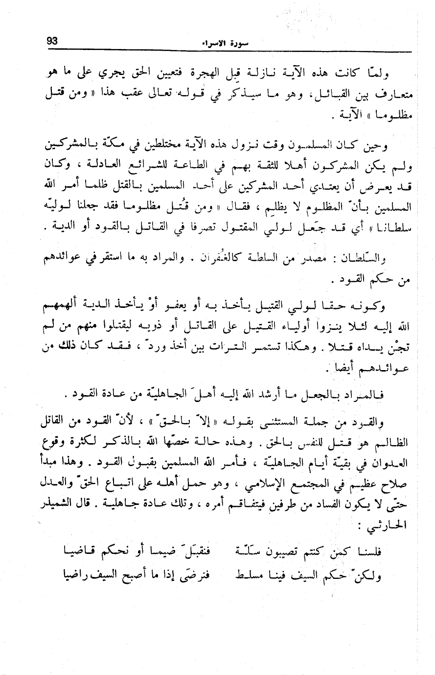 وَمَنْ قُتِلَ مَظْلُوماً فَقَدْ جَعَلْنا لِوَلِيِّهِ سُلْطاناً أَيْ قَدْ جَعَلَ لِوَلِيِّ الْمَقْتُولِ تَصَرُّفًا فِي الْقَاتِلِ بِالْقَوَدِ أَوِ الدِّيَةِ.