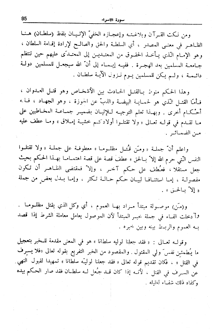 وَمِنْ نُكَتِ الْقُرْآنِ وَبَلَاغَتِهِ وَإِعْجَازِهِ الْخَفِيِّ الْإِتْيَانُ بِلَفْظِ (سُلْطَانٍ) هُنَا الظَّاهِرِ فِي مَعْنَى الْمَصْدَرِ، أَيِ السُّلْطَةِ وَالْحَقِّ وَالصَّالِحِ لِإِرَادَةِ إِقَامَةِ السُّلْطَانِ، وَهُوَ الْإِمَامُ الَّذِي يَأْخُذُ الْحُقُوقَ مِنْ الْمُعْتَدِينَ إِلَى الْمُعْتَدَى عَلَيْهِمْ حِينَ تَنْتَظِمُ جَامِعَةُ الْمُسْلِمِينَ بَعْدَ الْهِجْرَةِ. فَفِيهِ إِيمَاءٌ إِلَى أَنَّ اللَّهَ سَيَجْعَلُ لِلْمُسْلِمِينَ دَوْلَةً دَائِمَةً، وَلَمْ يَكُنْ لِلْمُسْلِمِينَ يَوْمَ نُزُولِ الْآيَةِ سُلْطَانٌ.