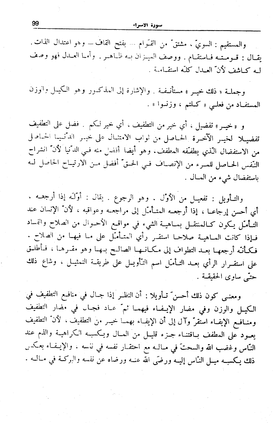 وَمَعْنَى كَوْنِ ذَلِكَ أَحْسَنَ تَأْوِيلًا: أَنَّ النَّظَرَ إِذَا جَالَ فِي مَنَافِعِ التَّطْفِيفِ فِي الْكَيْلِ وَالْوَزْنِ وَفِي مَضَارِّ الْإِيفَاءِ فِيهِمَا ثُمَّ عَادَ فَجَالَ فِي مَضَارِّ التَّطْفِيفِ وَمَنَافِعِ الْإِيفَاءِ اسْتَقَرَّ وَآلَ إِلَى أَنَّ الْإِيفَاءَ بِهِمَا خَيْرٌ مِنَ التَّطْفِيفِ، لِأَنَّ التَّطْفِيفَ يَعُودُ عَلَى الْمُطَفِّفِ بِاقْتِنَاءِ جُزْءٍ قَلِيلٍ مِنَ الْمَالِ وَيُكْسِبُهُ الْكَرَاهِيَةَ وَالذَّمَّ عِنْدَ النَّاسِ وَغَضَبَ اللَّهِ وَالسُّحْتَ فِي مَالِهِ مَعَ احْتِقَارِ نَفْسِهِ فِي نَفْسِهِ، وَالْإِيفَاءُ بِعَكْسِ ذَلِكَ يُكْسِبُهُ مَيْلَ النَّاسِ إِلَيْهِ وَرِضَى اللَّهِ عَنْهُ وَرِضَاهُ عَنْ نَفْسِهِ وَالْبَرَكَةَ فِي مَالِهِ