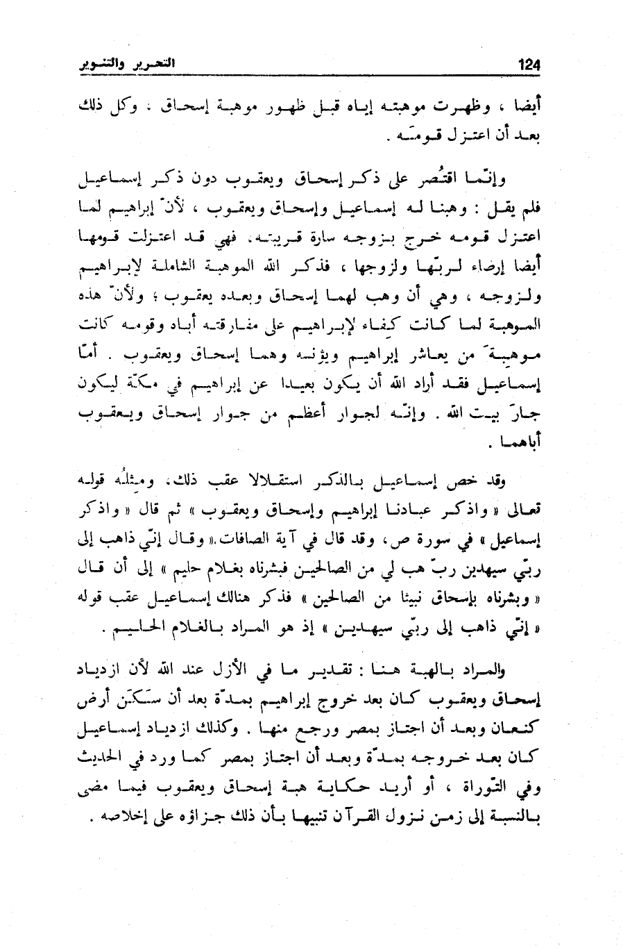 وَقَدْ خُصَّ إِسْمَاعِيلُ بِالذِّكْرِ اسْتِقْلَالًا عَقِبَ ذَلِكَ، وَمِثْلُهُ قَوْلُهُ تَعَالَى: وَاذْكُرْ عِبادَنا إِبْراهِيمَ وَإِسْحاقَ وَيَعْقُوبَ [ص: 45] ثُمَّ قَالَ: وَاذْكُرْ إِسْماعِيلَ فِي سُورَةِ ص [48] ، وَقَدْ قَالَ فِي آيَةِ الصَّافَّاتِ [99- 101] وَقالَ إِنِّي ذاهِبٌ إِلى رَبِّي سَيَهْدِينِ رَبِّ هَبْ لِي مِنَ الصَّالِحِينَ فَبَشَّرْناهُ بِغُلامٍ حَلِيمٍ إِلَى أَنْ قَالَ: وَبَشَّرْناهُ بِإِسْحاقَ نَبِيًّا مِنَ الصَّالِحِينَ فَذُكِرَ هُنَالِكَ إِسْمَاعِيلُ عَقِبَ قَوْلِهِ: إِنِّي ذاهِبٌ إِلى رَبِّي سَيَهْدِينِ إِذْ هُوَ الْمُرَادُ بِالْغُلَامِ الْحَلِيمِ.
