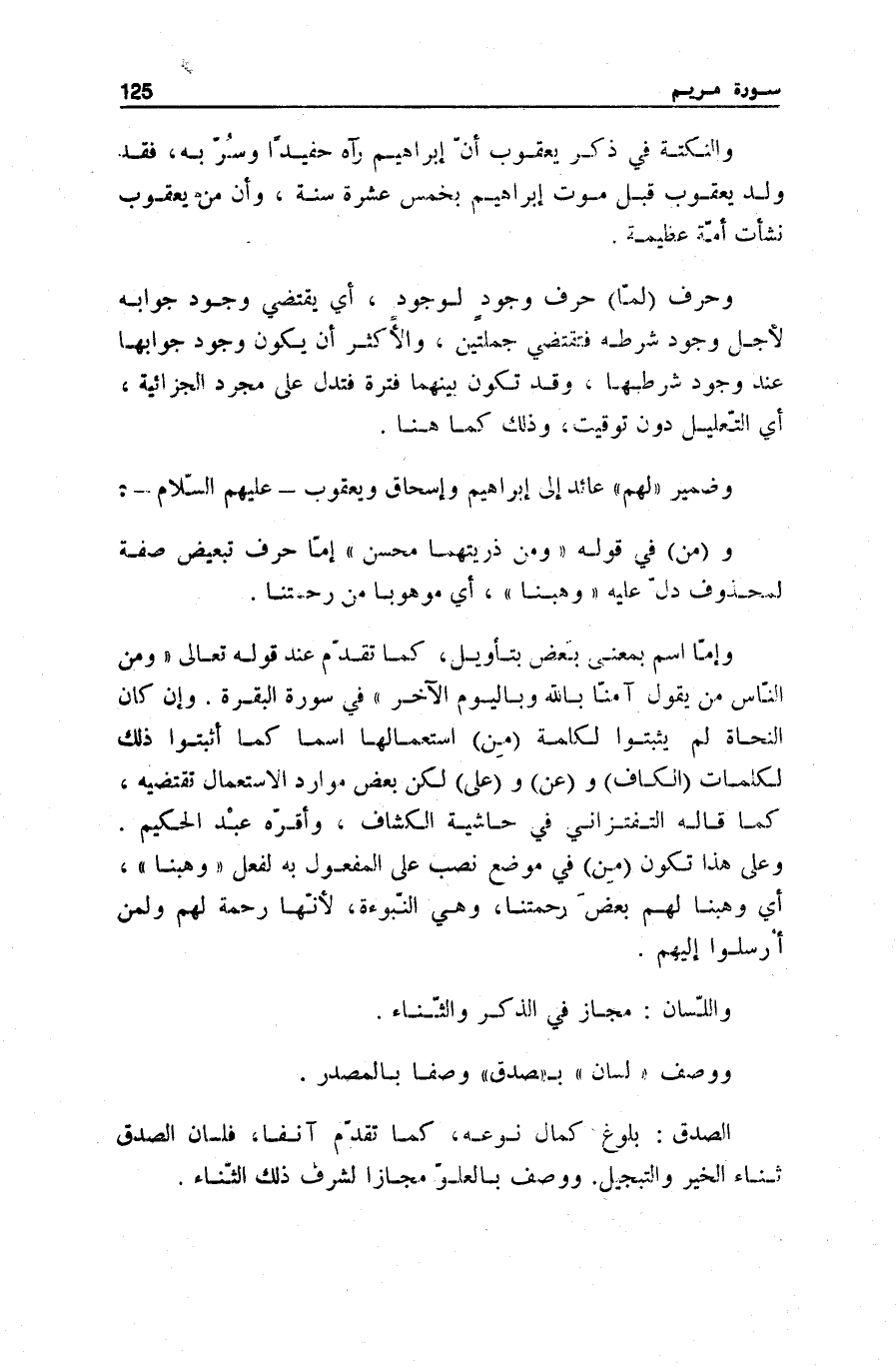 وَإِنْ كَانَ النُّحَاةُ لَمْ يُثْبِتُوا لِكَلِمَةٍ (مِنِ) اسْتِعْمَالِهَا اسْمًا كَمَا أَثْبَتُوا ذَلِكَ لكلمات (الْكَاف) و (عَن) و (على) لَكِنَّ بَعْضَ مَوَارِدِ الِاسْتِعْمَالِ تَقْتَضِيه، كَمَا قَالَ التفتازانيّ فِي «حَاشِيَةِ الْكَشَّافِ» ، وَأَقَرَّهُ عَبْدُ الْحَكِيمِ. وَعَلَى هَذَا تَكُونُ (مِنْ) فِي مَوْضِعِ نَصْبٍ عَلَى الْمَفْعُولِ بِهِ لِفِعْلِ وَهَبْنا، أَيْ وَهَبْنَا لَهُمْ بَعْضَ رَحْمَتِنَا، وَهِيَ النُّبُوءَةُ، لِأَنَّهَا رَحْمَةٌ لَهُمْ وَلِمَنْ أُرْسِلُوا إِلَيْهِمْ.