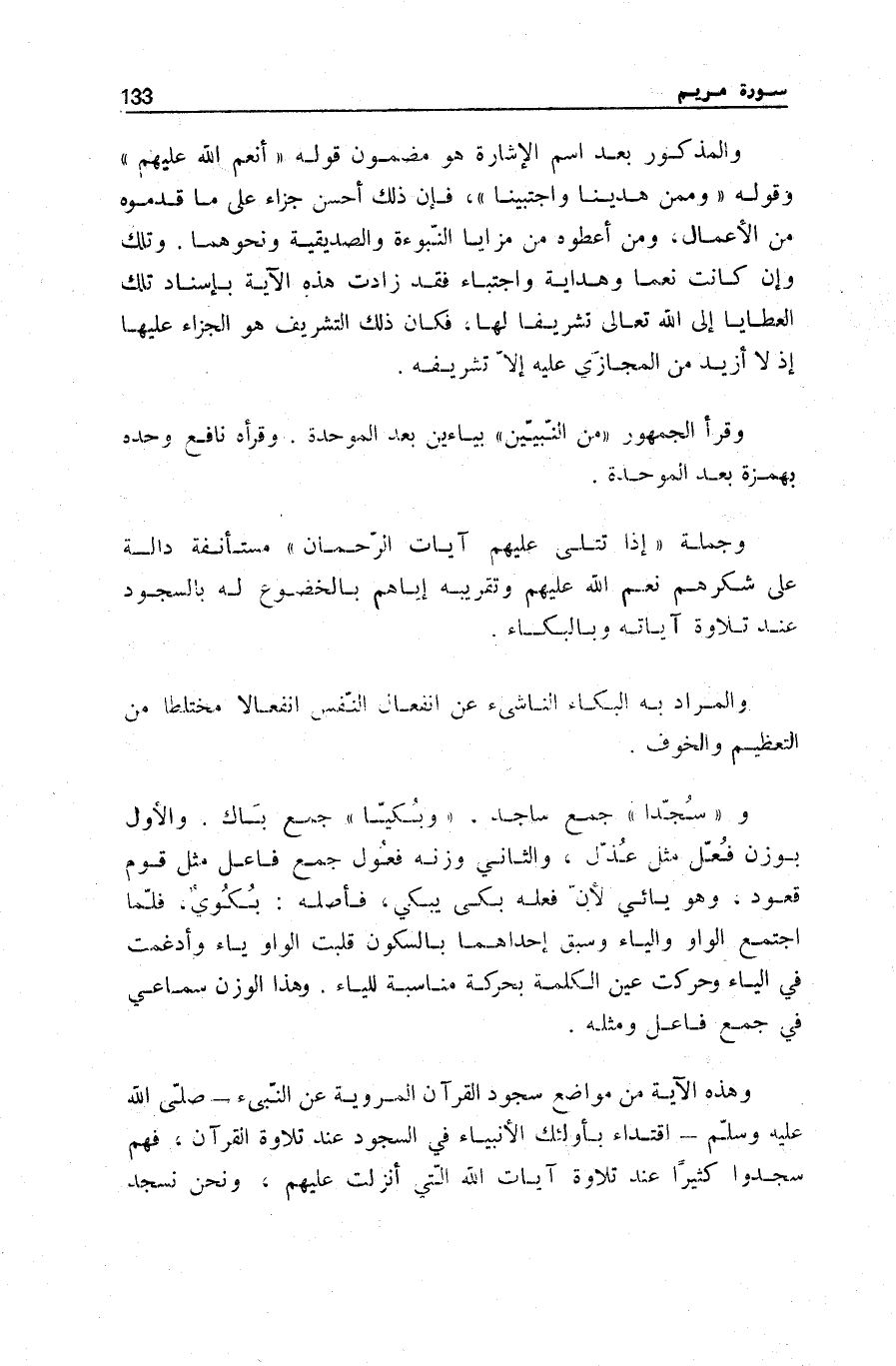 وسُجَّداً جَمْعُ سَاجِدٍ. وَبُكِيًّا جَمْعُ بَاكٍ. وَالْأَوَّلُ بِوَزْنِ فُعَّلَ مِثْلُ عُذَّلٍ، وَالثَّانِي وَزَنُهُ فُعُولٌ جَمْعُ فَاعِلٍ مِثْلُ قَوْمٍ قعُود، وَهُوَ يائي لِأَنَّ فِعْلَهُ بَكَى يَبْكِي، فَأَصْلُهُ: بُكُويٌّ. فَلَمَّا اجْتَمَعَ الْوَاوُ وَالْيَاءُ وَسُبِقَ إِحْدَاهُمَا بِالسُّكُونِ قُلِبَتِ الْوَاوُ يَاءً وَأُدْغِمَتْ فِي الْيَاءِ وَحُرِّكَتْ عَيْنُ الْكَلِمَةِ بِحَرَكَةٍ مُنَاسِبَةٍ لِلْيَاءِ. وَهَذَا الْوَزْنُ سَمَاعِيُّ فِي جَمْعِ فَاعِلٍ وَمِثْلِهِ.