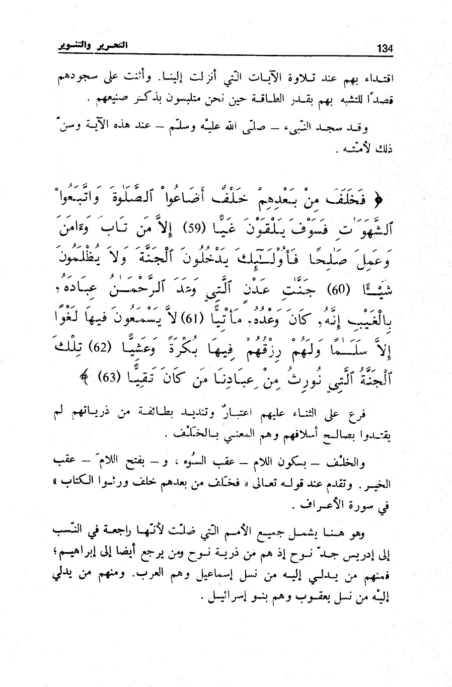 فَخَلَفَ مِنْ بَعْدِهِمْ خَلْفٌ أَضاعُوا الصَّلاةَ وَاتَّبَعُوا الشَّهَواتِ فَسَوْفَ يَلْقَوْنَ غَيًّا (59) إِلاَّ مَنْ تابَ وَآمَنَ وَعَمِلَ صالِحاً فَأُولئِكَ يَدْخُلُونَ الْجَنَّةَ وَلا يُظْلَمُونَ شَيْئاً (60) جَنَّاتِ عَدْنٍ الَّتِي وَعَدَ الرَّحْمنُ عِبادَهُ بِالْغَيْبِ إِنَّهُ كانَ وَعْدُهُ مَأْتِيًّا (61) لَا يَسْمَعُونَ فِيها لَغْواً إِلاَّ سَلاماً وَلَهُمْ رِزْقُهُمْ فِيها بُكْرَةً وَعَشِيًّا (62) تِلْكَ الْجَنَّةُ الَّتِي نُورِثُ مِنْ عِبادِنا مَنْ كانَ تَقِيًّا (63)