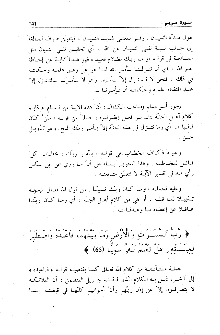طُولِ مُدَّةِ النِّسْيَانِ. وَفُسِّرَ بِمَعْنَى شَدِيدِ النِّسْيَانِ، فَيَتَعَيَّنُ صَرْفُ الْمُبَالَغَةِ إِلَى جَانِبِ نِسْبَةِ نفي النسْيَان عَن اللَّهِ، أَيْ تَحْقِيقُ نَفْيِ النِّسْيَانِ مِثْلَ الْمُبَالَغَةِ فِي قَوْلِهِ وَما رَبُّكَ بِظَلَّامٍ لِلْعَبِيدِ [فصّلت: 46] فَهُوَ هُنَا كِنَايَةٌ عَنْ إِحَاطَةِ عِلْمِ اللَّهِ، أَيْ أَنَّ تَنَزُّلَنَا بِأَمْرِ اللَّهِ لِمَا هُوَ عَلَى وَفْقِ عِلْمِهِ وَحِكْمَتِهِ فِي ذَلِكَ، فَنَحْنُ لَا نَتَنَزَّلُ إِلَّا بِأَمْرِهِ.