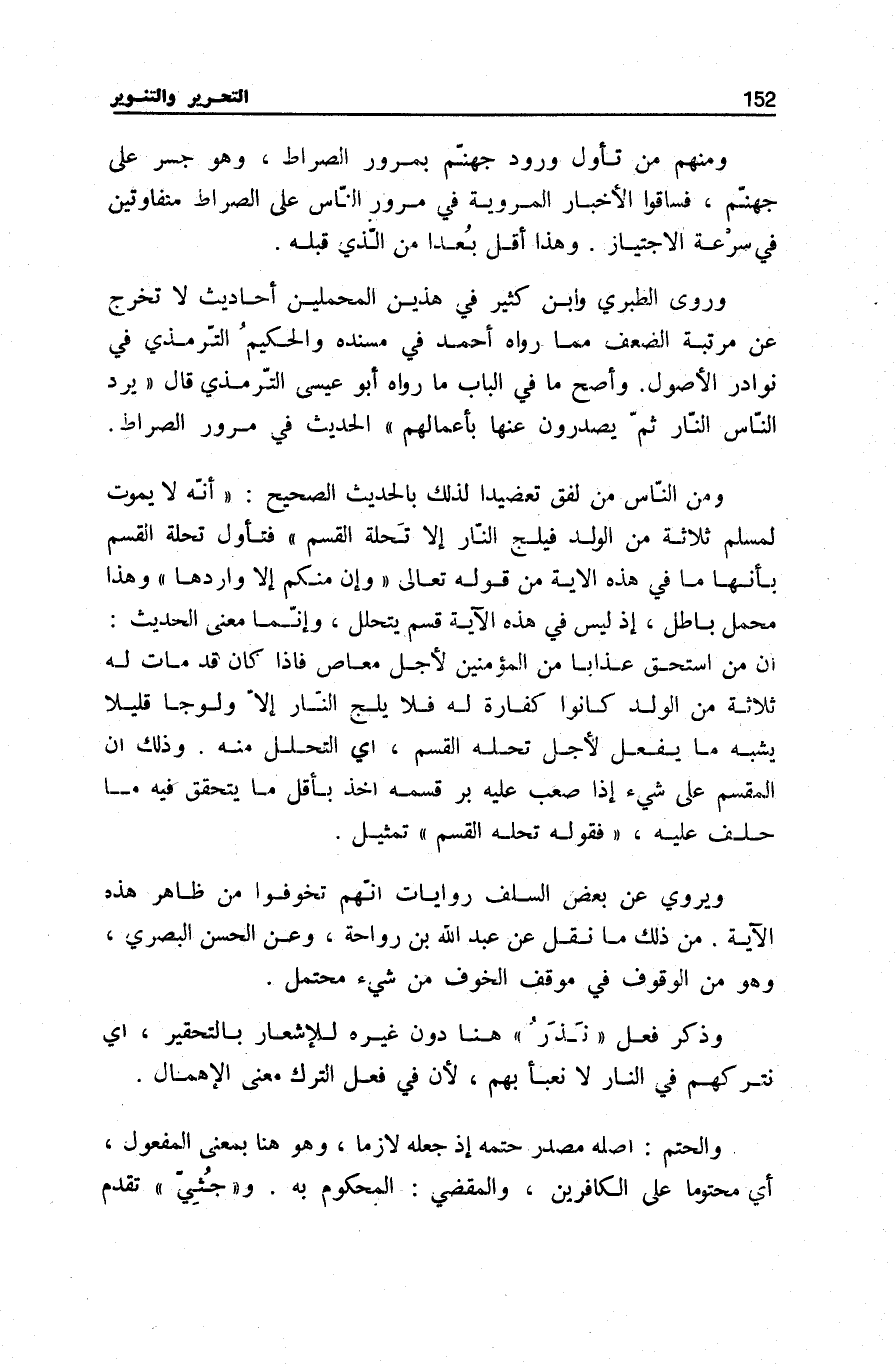 تَعَالَى: وَإِنْ مِنْكُمْ إِلَّا وارِدُها وَهَذَا مَحَمَلٌ بَاطِلٌ، إِذْ لَيْسَ فِي هَذِهِ الْآيَةِ قَسَمٌ يَتَحَلَّلُ، وَإِنَّمَا مَعْنَى الْحَدِيثِ: أَنَّ مَنِ اسْتَحَقَّ عَذَابًا مِنَ الْمُؤْمِنِينَ لِأَجْلِ مَعَاصٍ فَإِذَا كَانَ قَدْ مَاتَ لَهُ ثَلَاثَةٌ مِنَ الْوَلَدِ كَانُوا كَفَّارَةً لَهُ فَلَا يَلِجُ النَّارَ إِلَّا وُلُوجًا قَلِيلًا يُشْبِهُ مَا يُفْعَلُ لِأَجَلِ تَحِلَّةِ الْقَسْمِ، أَيِ التَّحَلُّلِ مِنْهُ. وَذَلِكَ أَنَّ الْمُقْسِمَ عَلَى شَيْءٍ إِذَا صَعُبَ عَلَيْهِ بِرُّ قَسَمِهِ أَخَذَ بِأَقَلِّ مَا يَتَحَقَّقُ فِيهِ مَا حَلَفَ عَلَيْهِ،