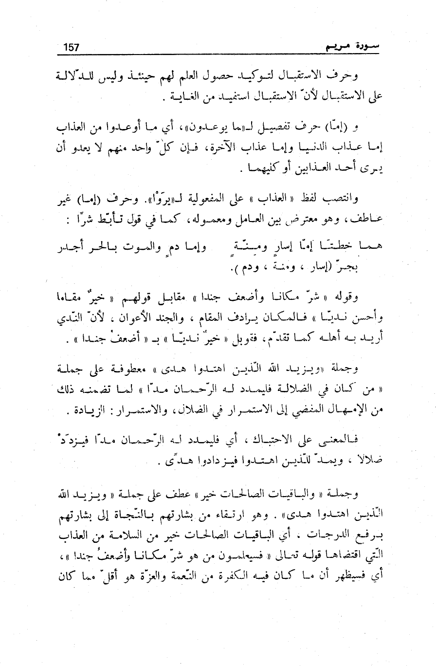 وَانْتَصَبَ لَفْظُ الْعَذابَ عَلَى المفعولية ل رَأَوْا. وَحَرْفُ إِمَّا غَيْرُ عَاطِفٍ، وَهُوَ مُعْتَرِضٌ بَيْنَ الْعَامِلِ وَمَعْمُولِهِ، كَمَا فِي قَوْلِ تَأَبَّطَ شَرًّا: