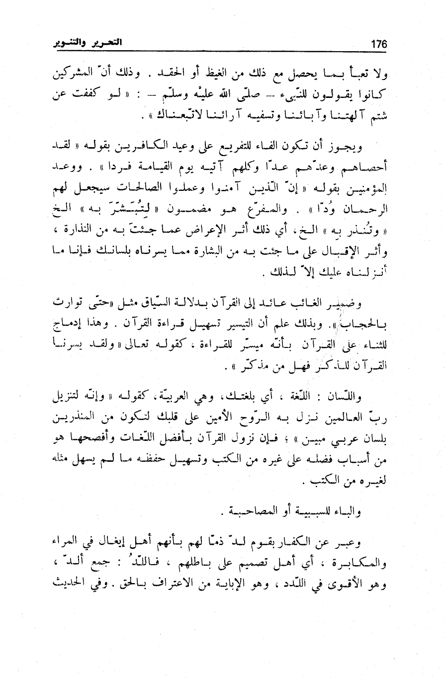 وَيَجُوزُ أَنْ تَكُونَ الْفَاءُ لِلتَّفْرِيعِ عَلَى وَعِيدِ الْكَافِرِينَ بِقَوْلِهِ: لَقَدْ أَحْصاهُمْ وَعَدَّهُمْ عَدًّا وَكُلُّهُمْ آتِيهِ يَوْمَ الْقِيامَةِ فَرْداً [مَرْيَم: 94، 95] . وَوَعَدَ الْمُؤْمِنِينَ بِقَوْلِهِ: إِنَّ الَّذِينَ آمَنُوا وَعَمِلُوا الصَّالِحاتِ سَيَجْعَلُ لَهُمُ الرَّحْمنُ وُدًّا [مَرْيَم: 96] . وَالْمُفَرَّعُ هُوَ مَضْمُونُ لِتُبَشِّرَ بِهِ إِلَخْ وَتُنْذِرَ بِهِ إِلَخْ، أَيْ ذَلِكَ أَثَرُ الْإِعْرَاضِ عَمَّا جِئْتَ بِهِ مِنَ النِّذَارَةِ، وَأَثَرُ الْإِقْبَالِ عَلَى مَا جِئْتَ بِهِ مِنَ الْبِشَارَةِ مِمَّا يَسَّرْنَاهُ بِلِسَانِكَ فَإِنَّا مَا أَنْزَلْنَاهُ عَلَيْكَ إِلَّا لِذَلِكَ.