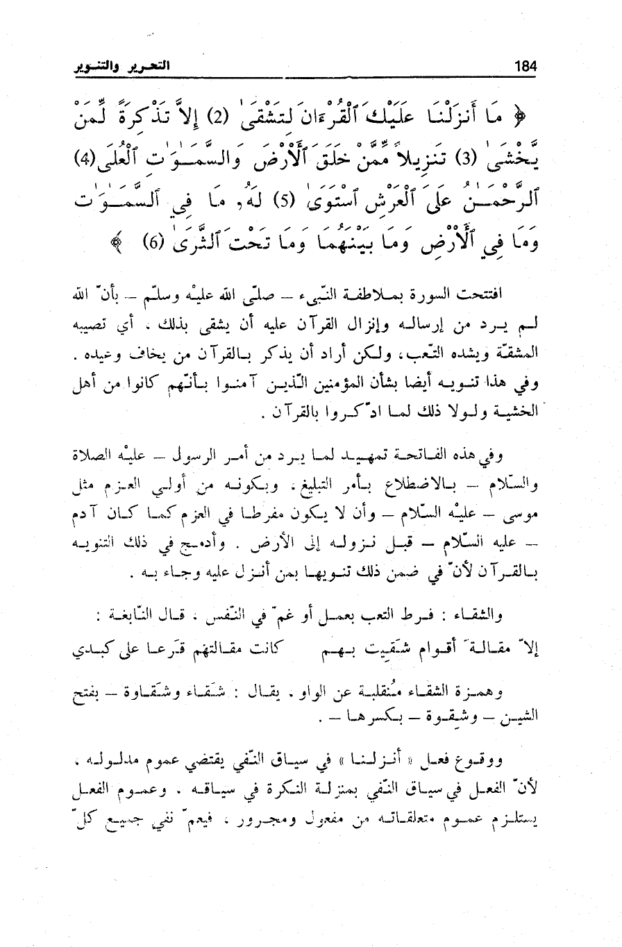 مَا أَنْزَلْنا عَلَيْكَ الْقُرْآنَ لِتَشْقى (2) إِلاَّ تَذْكِرَةً لِمَنْ يَخْشى (3) تَنْزِيلاً مِمَّنْ خَلَقَ الْأَرْضَ وَالسَّماواتِ الْعُلى (4) الرَّحْمنُ عَلَى الْعَرْشِ اسْتَوى (5) لَهُ مَا فِي السَّماواتِ وَما فِي الْأَرْضِ وَما بَيْنَهُما وَما تَحْتَ الثَّرى (6)