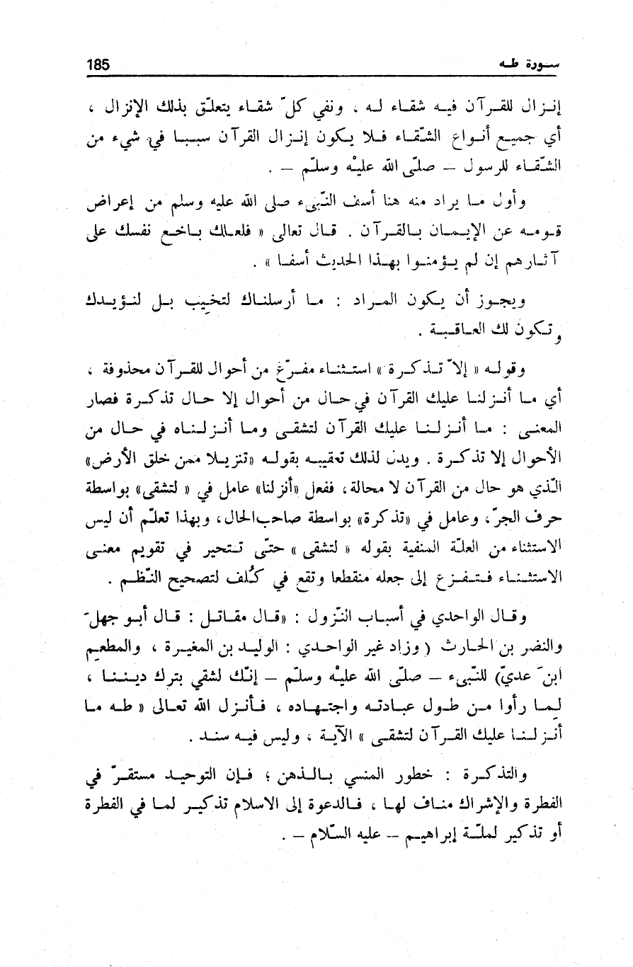 وَقَوْلُهُ إِلَّا تَذْكِرَةً اسْتِثْنَاءٌ مُفَرَّغٌ مِنْ أَحْوَالٍ لِلْقُرْآنِ مَحْذُوفَةٍ، أَيْ مَا أَنْزَلَنَا عَلَيْكَ الْقُرْآنَ فِي حَالٍ مِنْ أَحْوَالٍ إِلَّا حَالَ تَذْكِرَةٍ فَصَارَ الْمَعْنَى: مَا أَنْزَلْنَا عَلَيْكَ الْقُرْآنَ لِتَشْقَى وَمَا أَنْزَلْنَاهُ فِي حَالٍ مِنَ الْأَحْوَالِ إِلَّا تَذْكِرَةً. وَيَدُلُّ لِذَلِكَ تَعْقِيبُهُ بِقَوْلِهِ تَنْزِيلًا مِمَّنْ خَلَقَ الْأَرْضَ الَّذِي هُوَ حَالٌ مِنَ الْقُرْآنِ لَا مَحَالَةَ، فَفِعْلُ أَنْزَلْنا عَامِلٌ فِي لِتَشْقى بِوَاسِطَةِ حَرْفِ الْجَرِّ، وَعَامِلٌ فِي تَذْكِرَةً بِوَاسِطَةِ صَاحِبِ الْحَالِ، وَبِهَذَا تَعْلَمُ أَنْ لَيْسَ الِاسْتِثْنَاءُ مِنَ الْعِلَّةِ الْمَنْفِيَّةِ بِقَوْلِهِ: لِتَشْقى حَتَّى تَتَحَيَّرَ فِي تَقْوِيمِ مَعْنَى الِاسْتِثْنَاءِ فَتَفْزَعَ إِلَى جَعْلِهِ مُنْقَطِعًا وَتَقَعَ فِي كَلَفٍ لِتَصْحِيحِ النَّظْمِ.