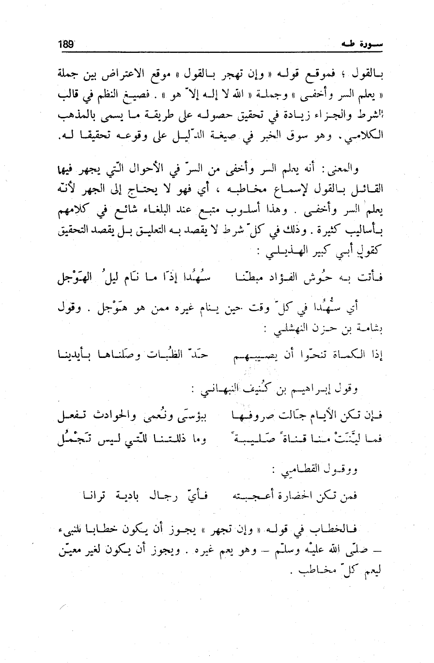 بِالْقَوْلِ فَمَوْقِعُ قَوْلِهِ: وَإِنْ تَجْهَرْ بِالْقَوْلِ مَوْقِعُ الِاعْتِرَاضِ بَيْنَ جُمْلَةِ يَعْلَمُ السِّرَّ وَأَخْفى وَجُمْلَةُ اللَّهُ لَا إِلهَ إِلَّا هُوَ. فَصِيغَ النَّظْمُ فِي قَالَبِ الشَّرْطِ وَالْجَزَاءِ زِيَادَةً فِي تَحْقِيقِ حُصُولِهِ عَلَى طَرِيقَةِ مَا يُسَمَّى بِالْمَذْهَبِ الْكَلَامِيِّ، وَهُوَ سَوْقُ الْخَبَرِ فِي صِيغَةِ الدَّلِيلِ عَلَى وُقُوعِهِ تَحْقِيقًا لَهُ.
