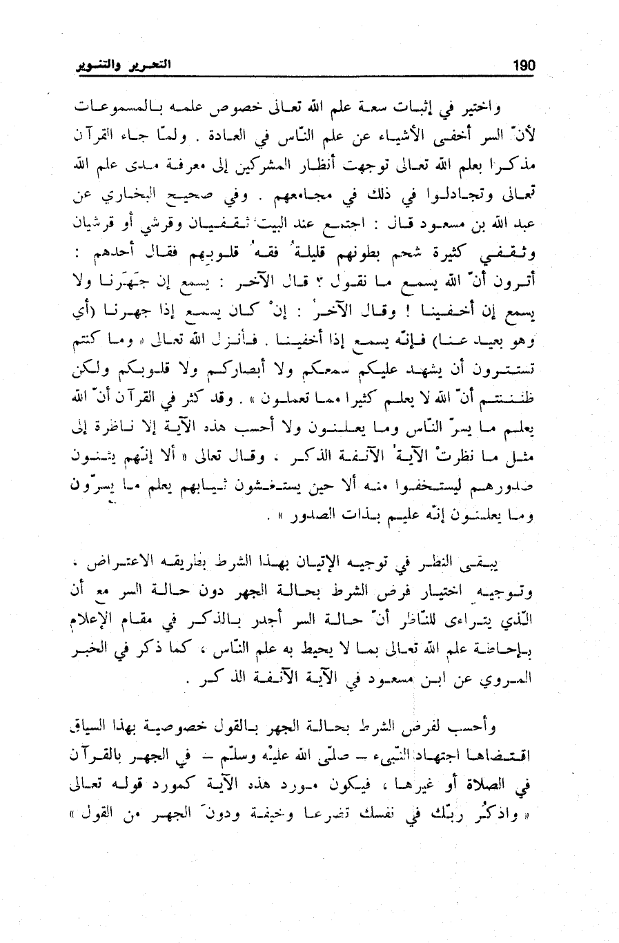 وَأَحْسَبُ لِفَرْضِ الشَّرْطِ بِحَالَةِ الْجَهْرِ بِالْقَوْلِ خُصُوصِيَّةً بِهَذَا السِّيَاقِ اقْتَضَاهَا اجْتِهَادُ النَّبِيءِ صَلَّى اللهُ عَلَيْهِ وَسَلَّمَ فِي الْجَهْرِ بِالْقُرْآنِ فِي الصَّلَاةِ أَوْ غَيْرِهَا، فَيَكُونُ مَوْرِدُ هَذِهِ الْآيَةِ كَمَوْرِدِ قَوْلِهِ تَعَالَى: وَاذْكُرْ رَبَّكَ فِي نَفْسِكَ تَضَرُّعاً وَخِيفَةً وَدُونَ الْجَهْرِ مِنَ الْقَوْلِ [الْأَعْرَاف: 205]