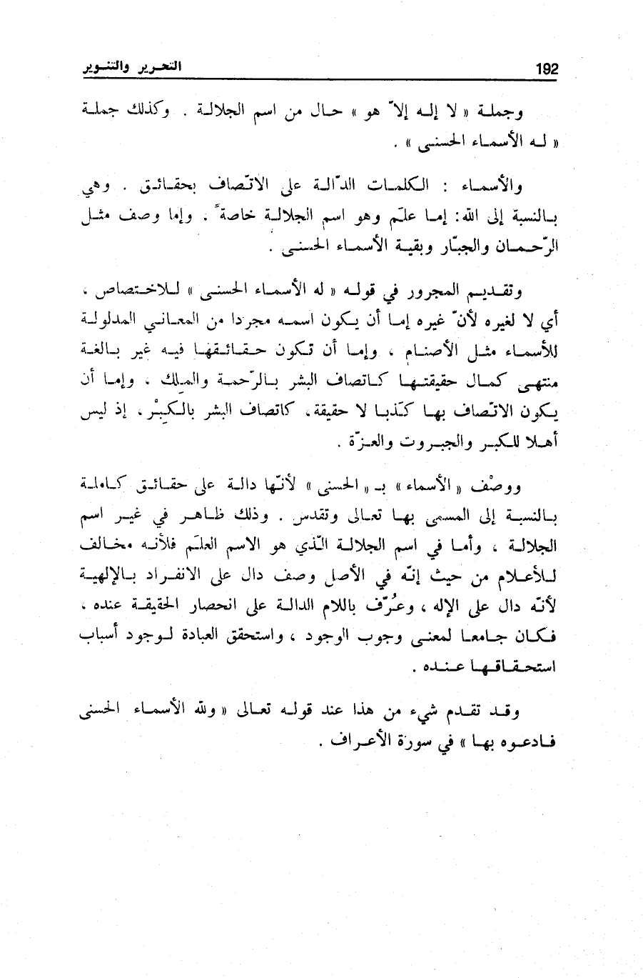 وَتَقْدِيمُ الْمَجْرُورِ فِي قَوْلِهِ لَهُ الْأَسْماءُ الْحُسْنى لِلِاخْتِصَاصِ، أَيْ لَا لِغَيْرِهِ لِأَنَّ غَيْرَهُ إِمَّا أَنْ يَكُونَ اسْمُهُ مُجَرَّدًا مِنَ الْمَعَانِي الْمَدْلُولَةِ لِلْأَسْمَاءِ مِثْلَ الْأَصْنَامِ، وَإِمَّا أَنْ تَكُونَ حَقَائِقُهَا فِيهِ غَيْرُ بَالِغَةٍ مُنْتَهَى كَمَالِ حَقِيقَتِهَا كَاتِّصَافِ الْبَشَرِ بِالرَّحْمَةِ وَالْمُلْكِ، وَإِمَّا أَنْ يَكُونَ الِاتِّصَافُ بِهَا كَذِبًا لَا حَقِيقَةً، كَاتِّصَافِ الْبَشَرِ بِالْكِبْرِ، إِذْ لَيْسَ أَهْلًا لِلْكِبْرِ وَالْجَبَرُوتِ وَالْعِزَّةِ.