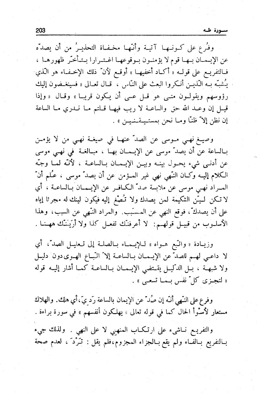 وَفُرِّعَ عَلَى كَوْنِهَا آتِيَةً وَأَنَّهَا مُخْفَاةٌ التَّحْذِيرُ مِنْ أَنْ يَصُدَّهُ عَنِ الْإِيمَانِ بِهَا قَوْمٌ لَا يُؤْمِنُونَ بِوُقُوعِهَا اغْتِرَارًا بِتَأَخُّرِ ظُهُورِهَا، فَالتَّفْرِيعُ عَلَى قَوْلِهِ أَكادُ أُخْفِيها أَوْقَعُ لِأَنَّ ذَلِكَ الْإِخْفَاءَ هُوَ الَّذِي يُشَبِّهُ بِهِ الَّذِينَ أَنْكَرُوا الْبَعْثَ عَلَى النَّاسِ، قَالَ تَعَالَى: فَسَيُنْغِضُونَ إِلَيْكَ رُؤُسَهُمْ وَيَقُولُونَ مَتى هُوَ قُلْ عَسى أَنْ يَكُونَ قَرِيباً [الْإِسْرَاء: 51] وَقَالَ: وَإِذا قِيلَ إِنَّ وَعْدَ اللَّهِ حَقٌّ وَالسَّاعَةُ لَا رَيْبَ فِيها قُلْتُمْ مَا نَدْرِي مَا السَّاعَةُ إِنْ نَظُنُّ إِلَّا ظَنًّا وَما نَحْنُ بِمُسْتَيْقِنِينَ [الجاثية: 32] .